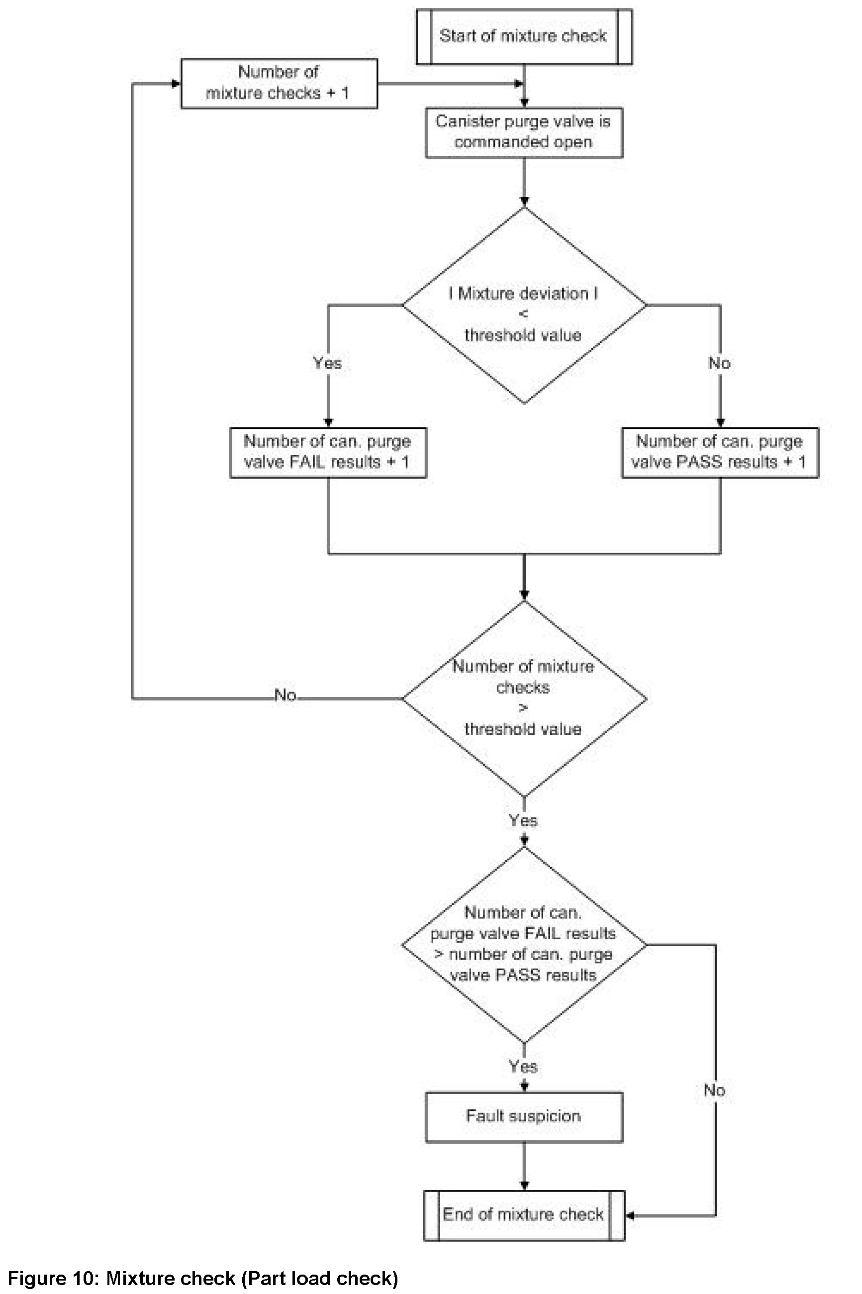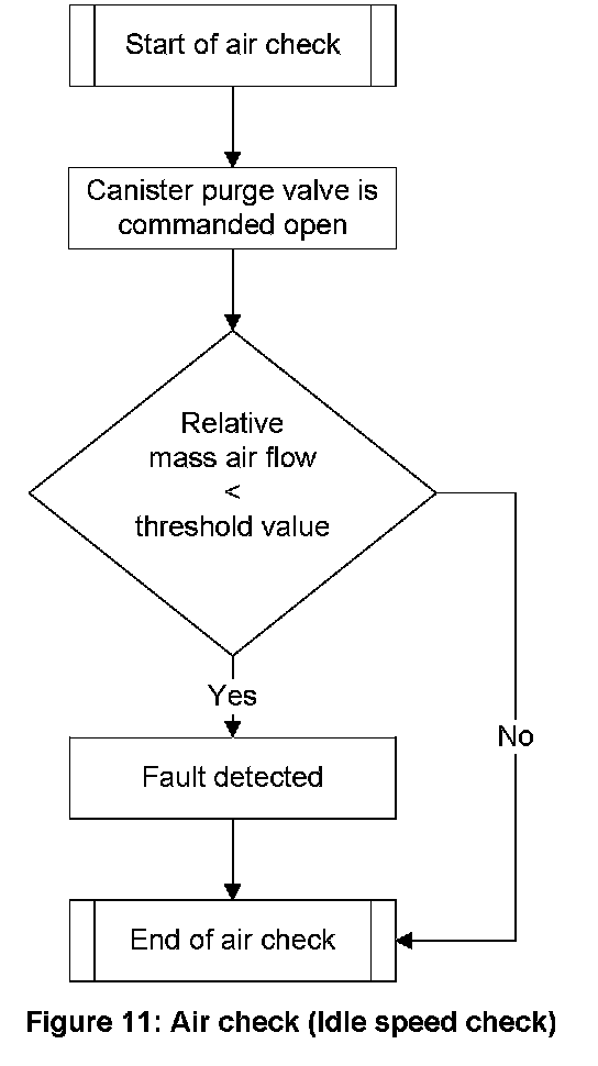 The part load check is the comparison between the mixture deviation that is present during the opening process of the canister purge valve and a threshold value. The idle speed check is the comparison between the ratio of expected mass air flow/actual mass air flow and a threshold value, performed while the purge valve is open.