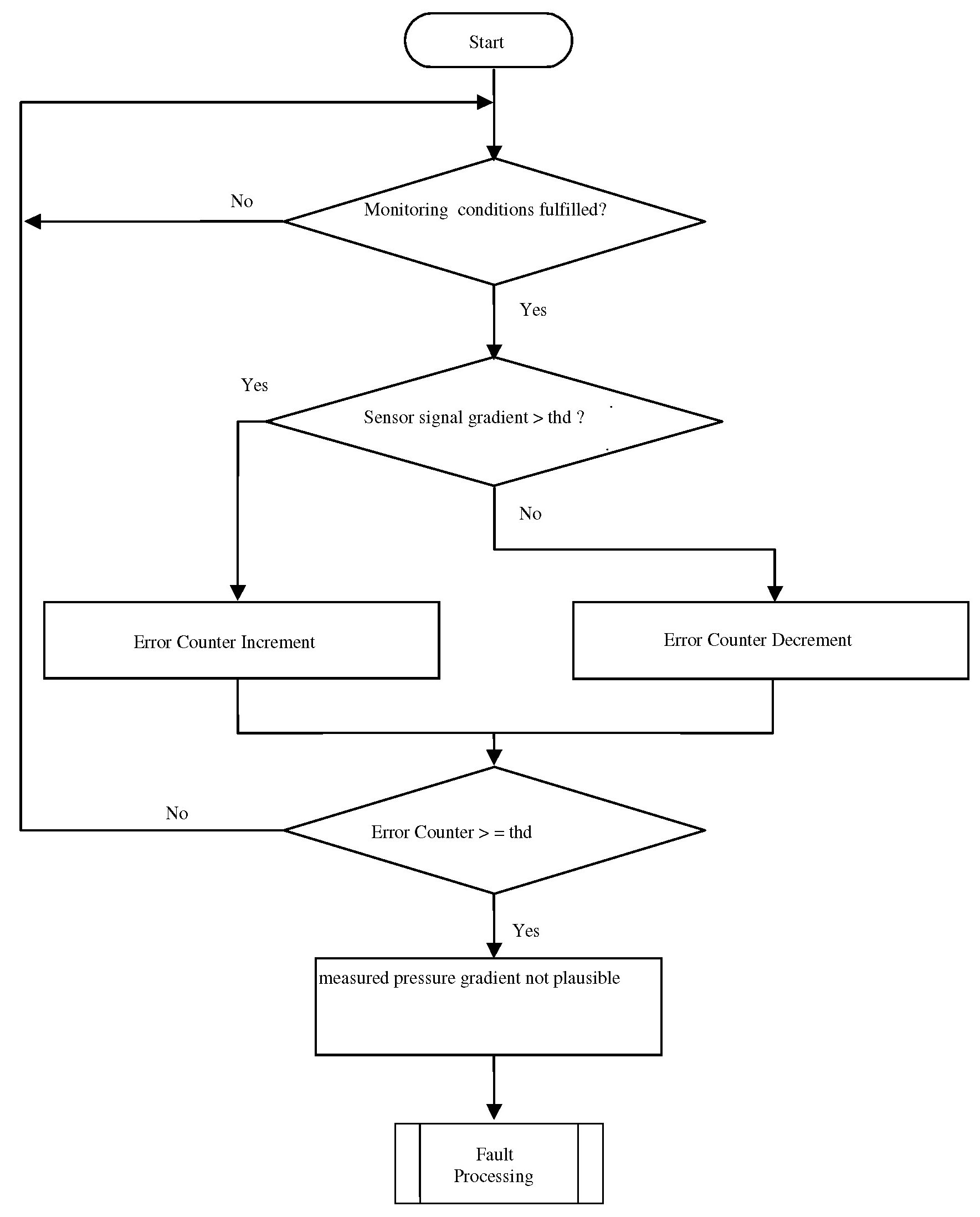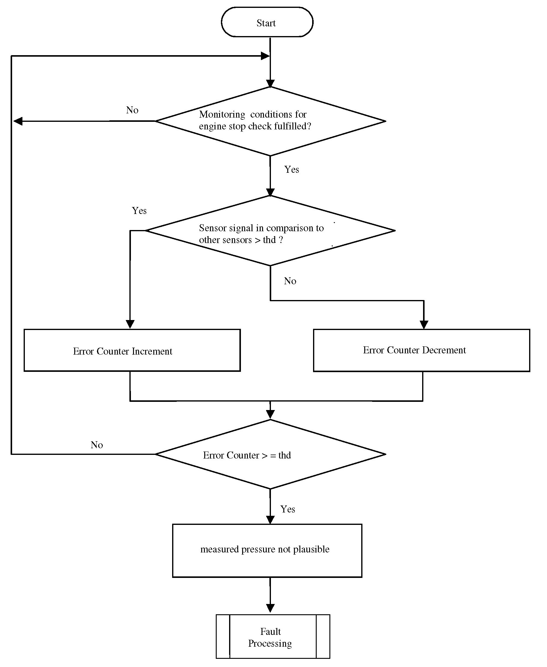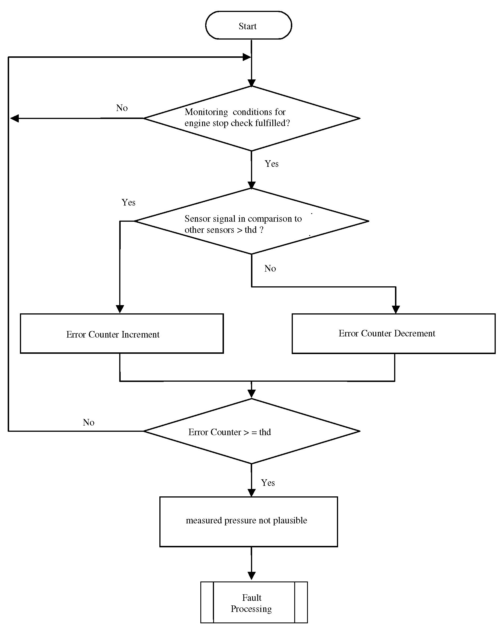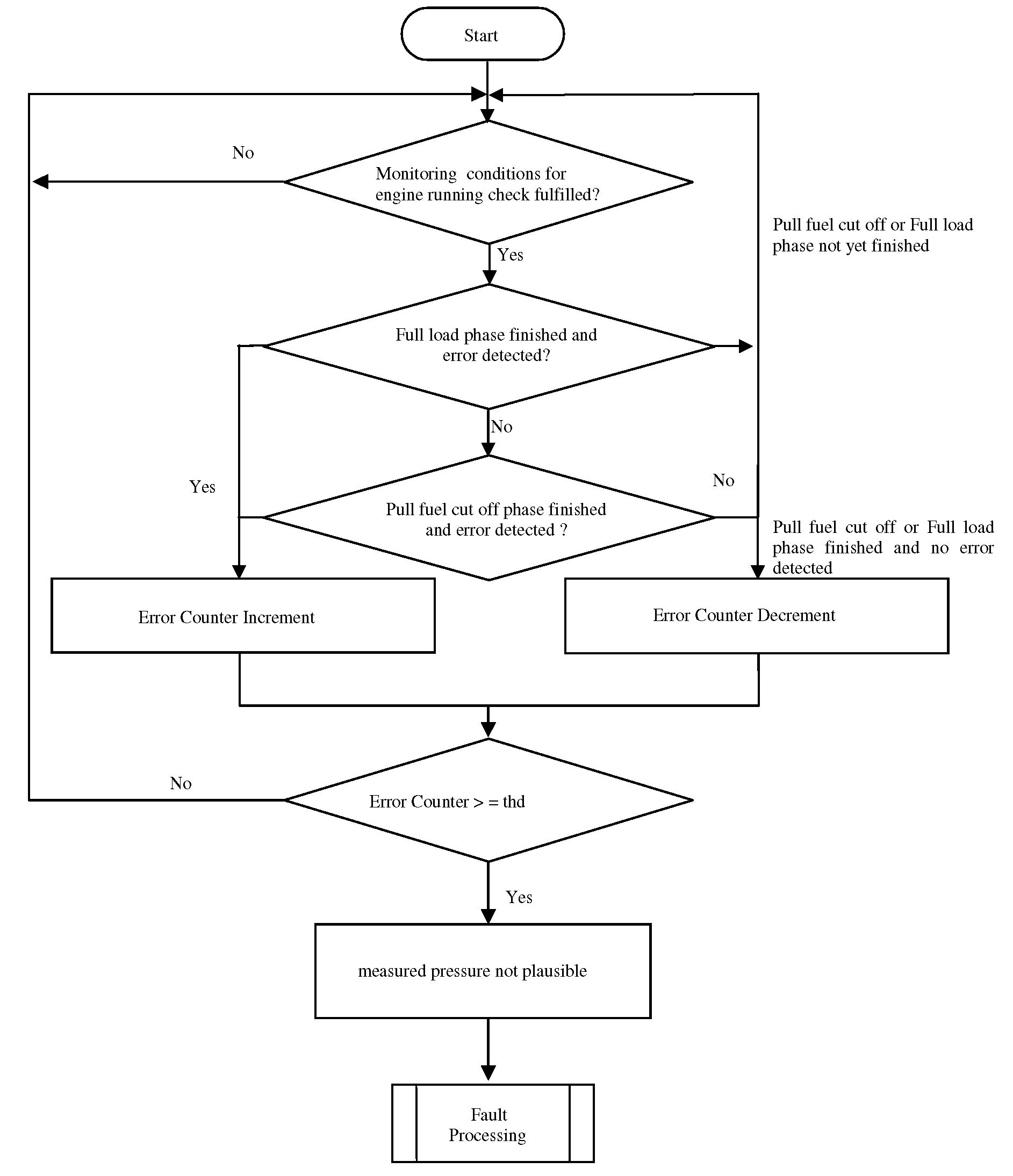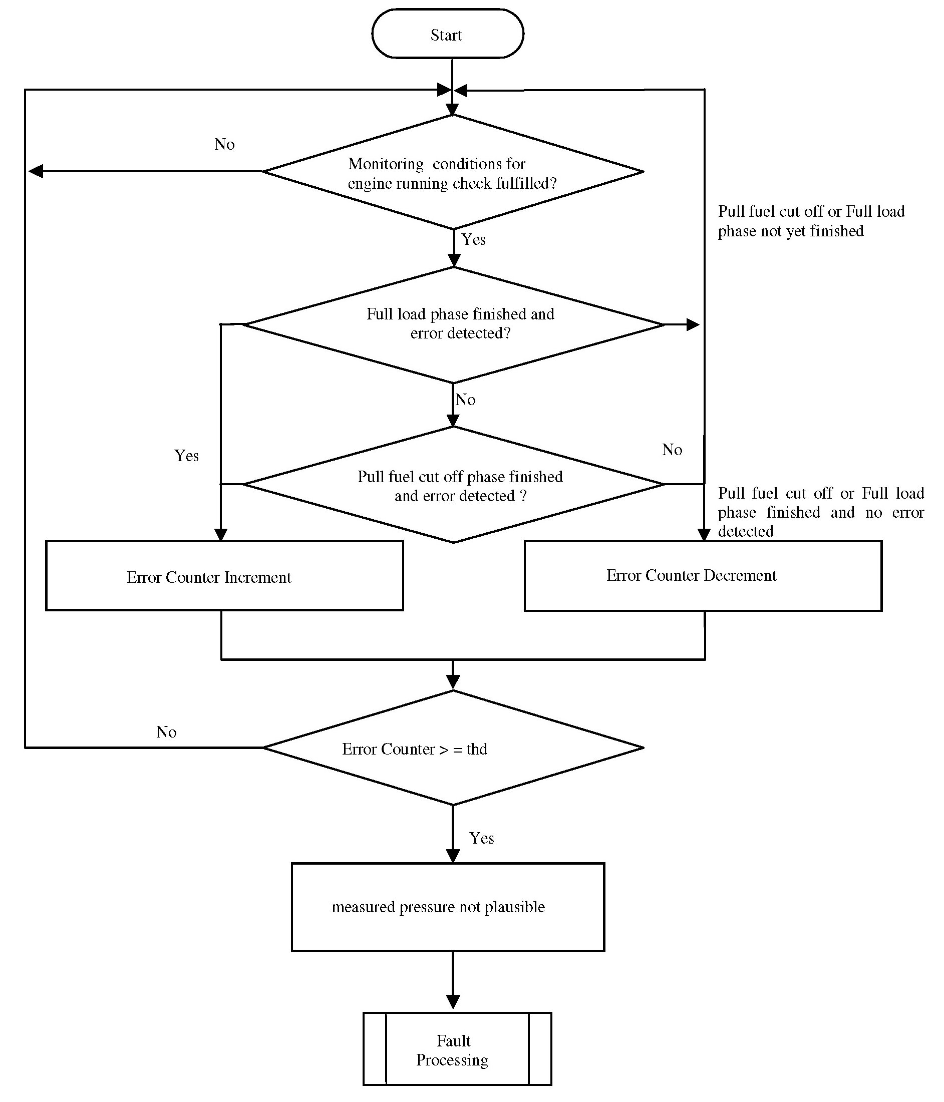 The purpose of this diagnosis is to detect faults as defined in OBD-II requirements. The input signal is the pressure value of the sensor. If the value is out of a calibratable range but inside the electrical error thresholds, an error symptom is set and an error counter is de-bounced.