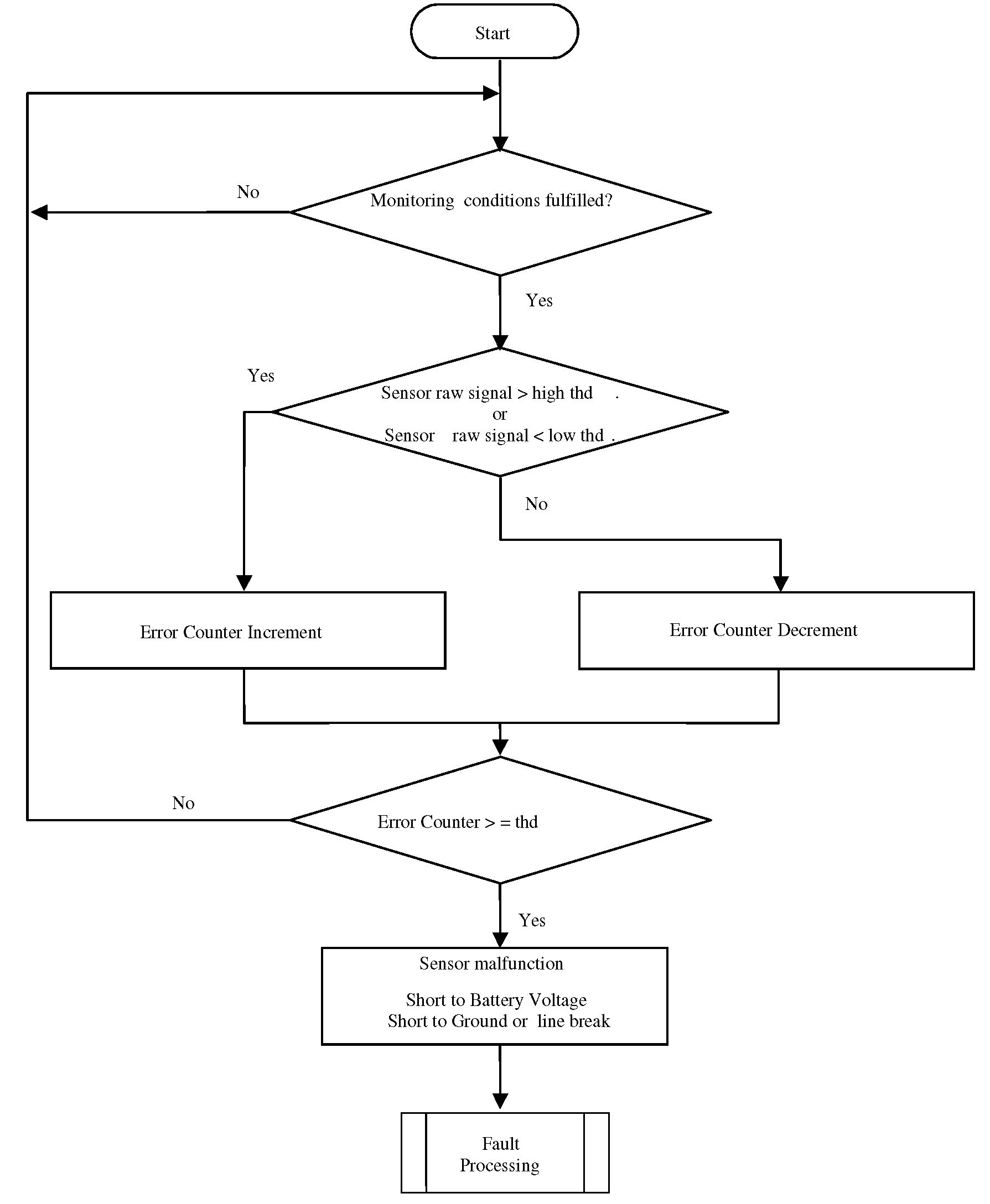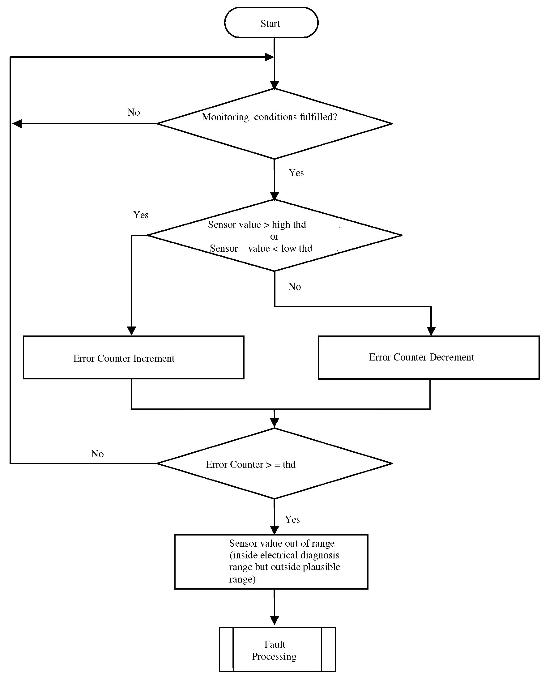 The purpose of this diagnosis is to detect electrical faults as defined in OBDI requirements. The input signal is the sensor voltage. If the voltage is out of a calibratable range, an error symptom is set and an error counter is de-bounced.