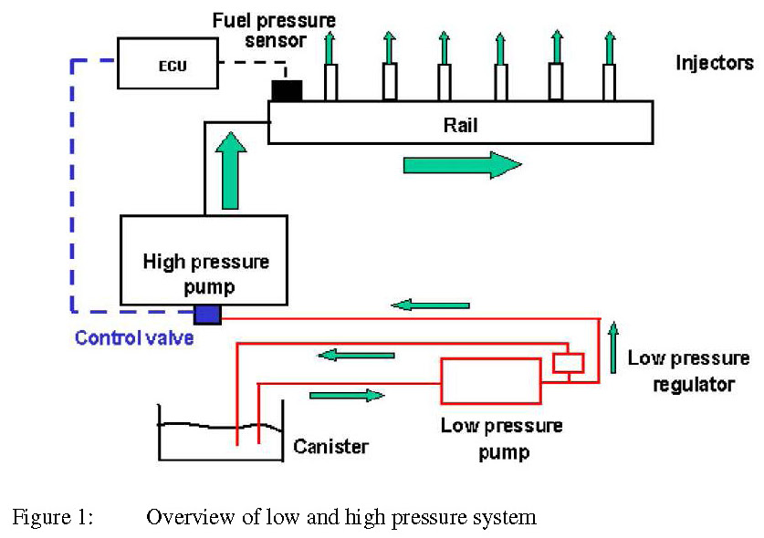 For gasoline direct fuel injection a high pressure fuel control system is necessary for fuel preparation and metering as shown in Figure 1. The low fuel pressure from the fuel pump module within the tank is increased by the high pressure fuel pump and adjusted to a desired set-point fuel pressure.