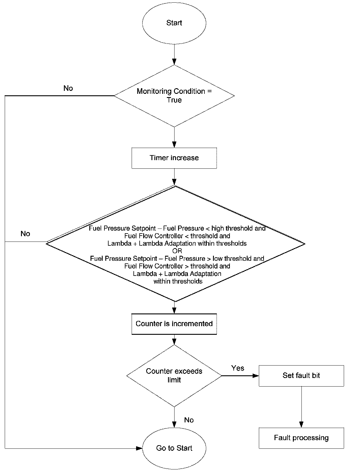 A not adjustable fuel rail pressure (to high) is detected if the measured fuel pressure is greater than the desired set-point fuel pressure with the result that the difference of these two values (setpoint - measured) is negative. If the negative difference lies below a calibrated threshold for a calibrated period of time, the flow controller exceeds calibrated negative value and the lambda controller stays inside calibrated thresholds, a malfunction is detected and a maximum fault High Pressure System monitoring is set.