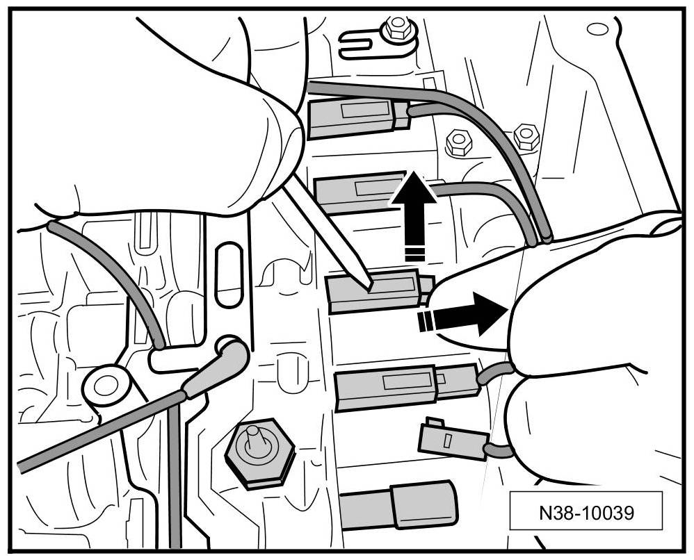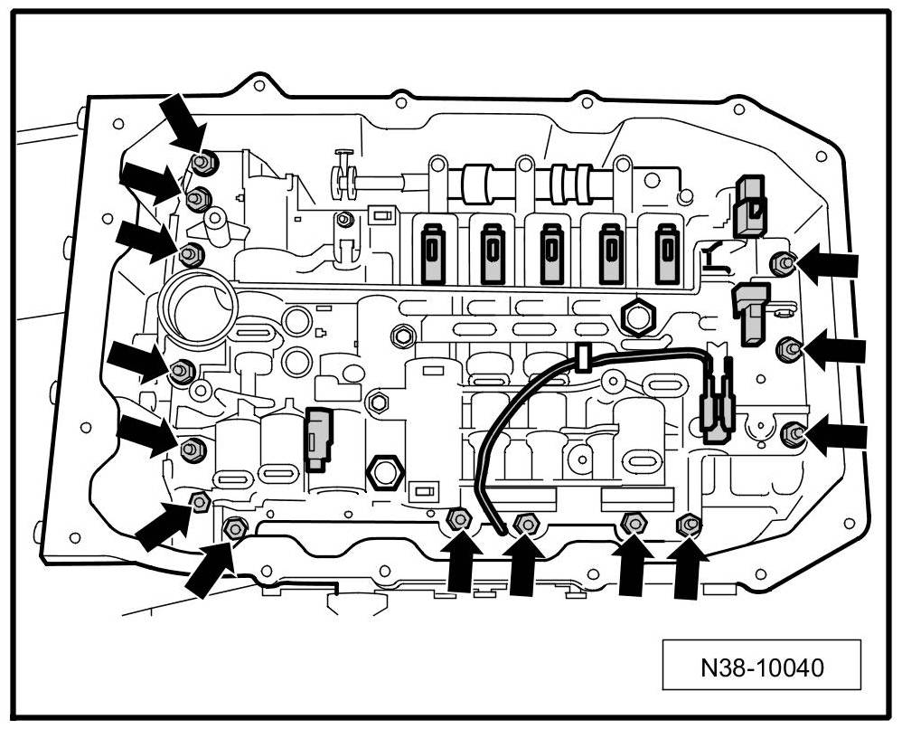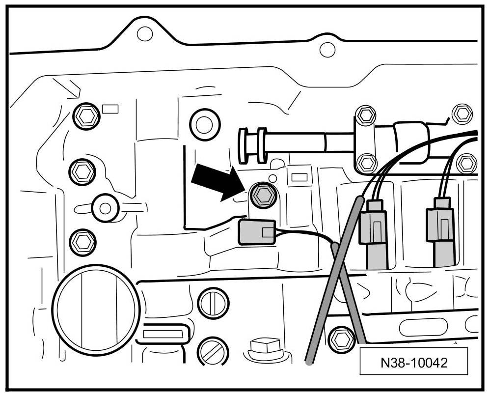 2. Screw in transmission fluid temperature sensor -arrow-. => Tightening torque: 10 Nm (7.5 ftlb.)