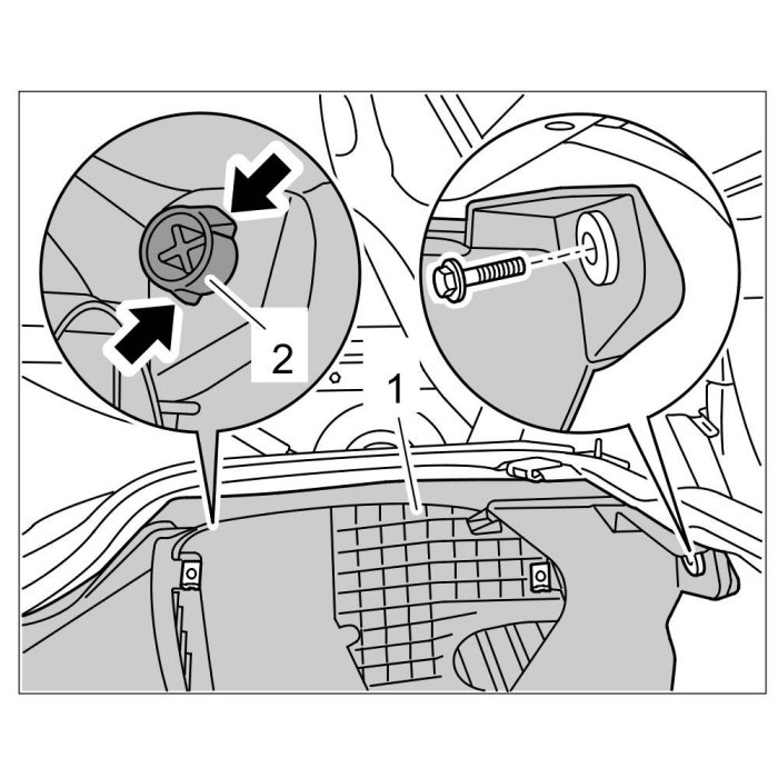 2. Press locking lugs -arrow- of retaining clip -2- together in the air cleaner housing -1- , pull off air cleaner housing and remove it in a downward direction.