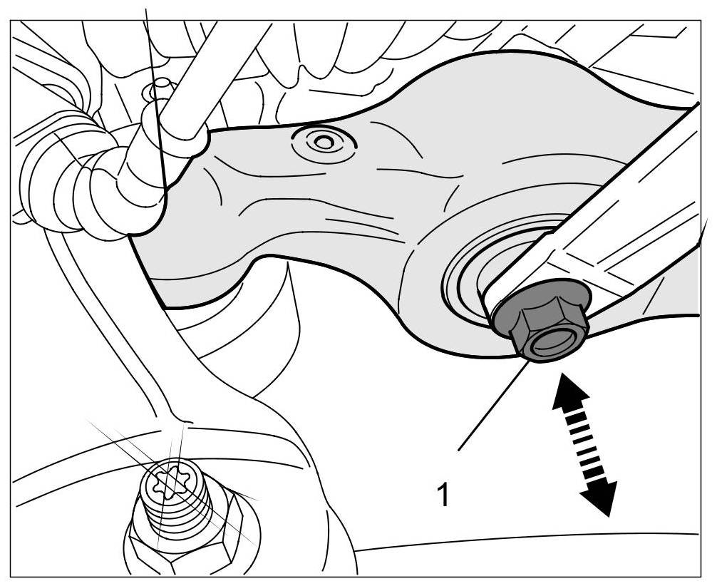 13. Loosen fastening nuts -1- on the lower control arm at both sides (do not remove the bolts yet!).