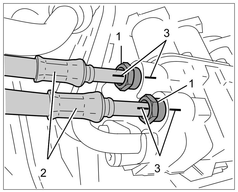 9.1. Mark the installation position of the steel flexi-pipes -2- on the steel flexi-pipes themselves and on the valve block using a suitable paint marker -3-.