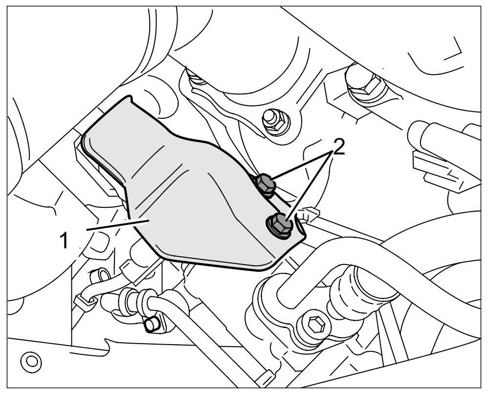 6. Fit heat protection panel -1- between the universal joint for the steering gear and the primary catalytic converter.