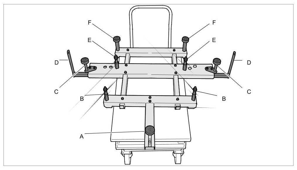 11. Place elevating platform Master Gear unit elevating platform WE 1206 under the vehicle and move all assembly drivers -A, B, C, D, E, F- to the same height at the correct position.