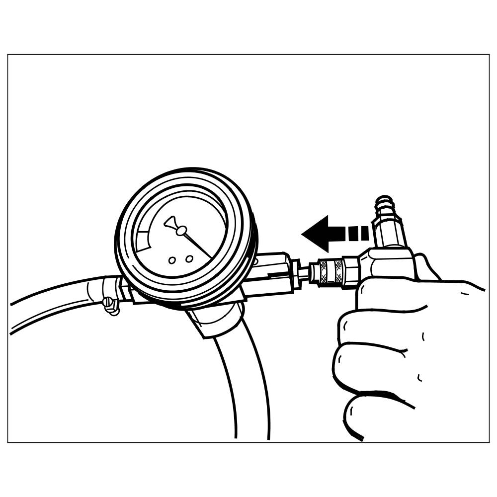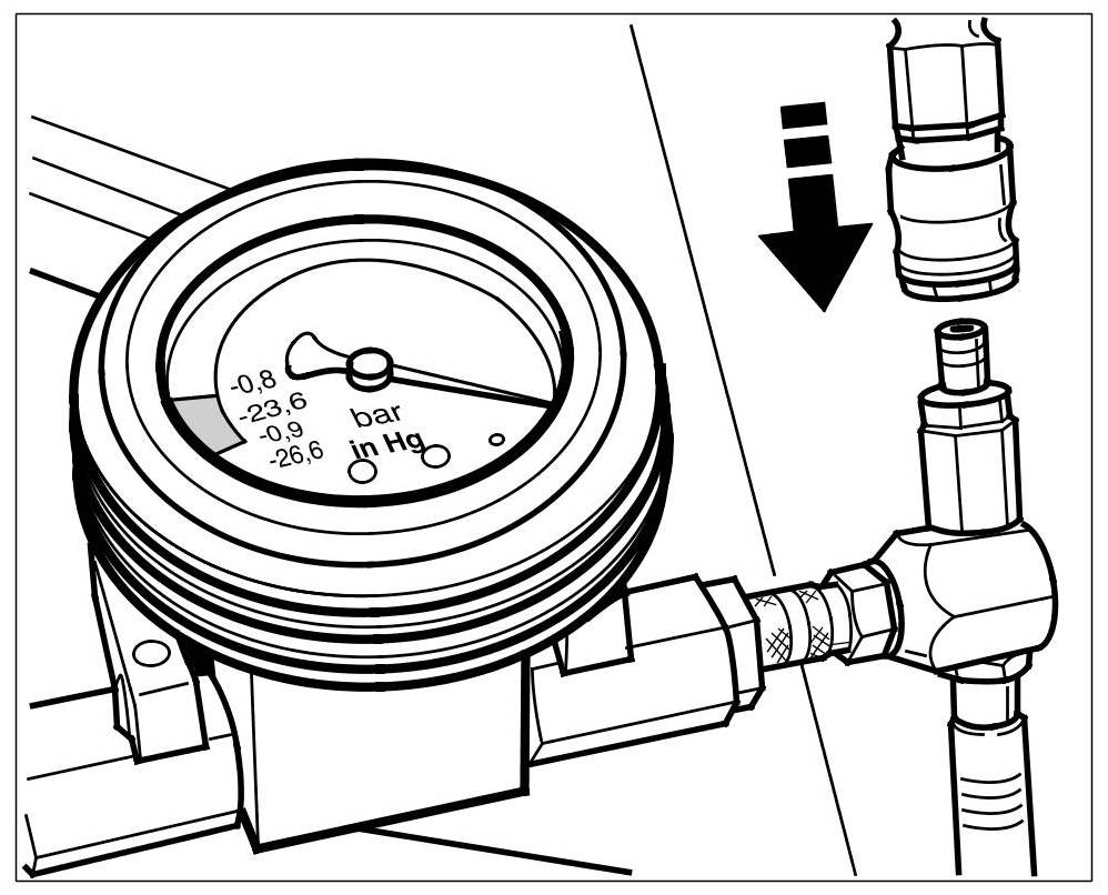3. Connect the vacuum pressure gauge of the bleeder tool to the flexible extension. When doing so, ensure that both shutoff valves are closed (positioned at 90° with respect to flow direction).