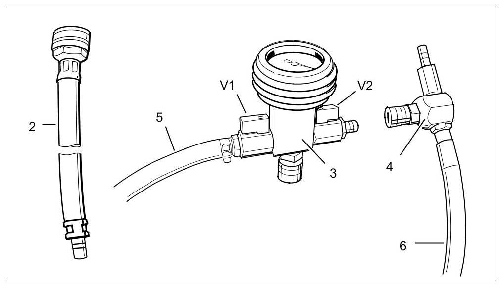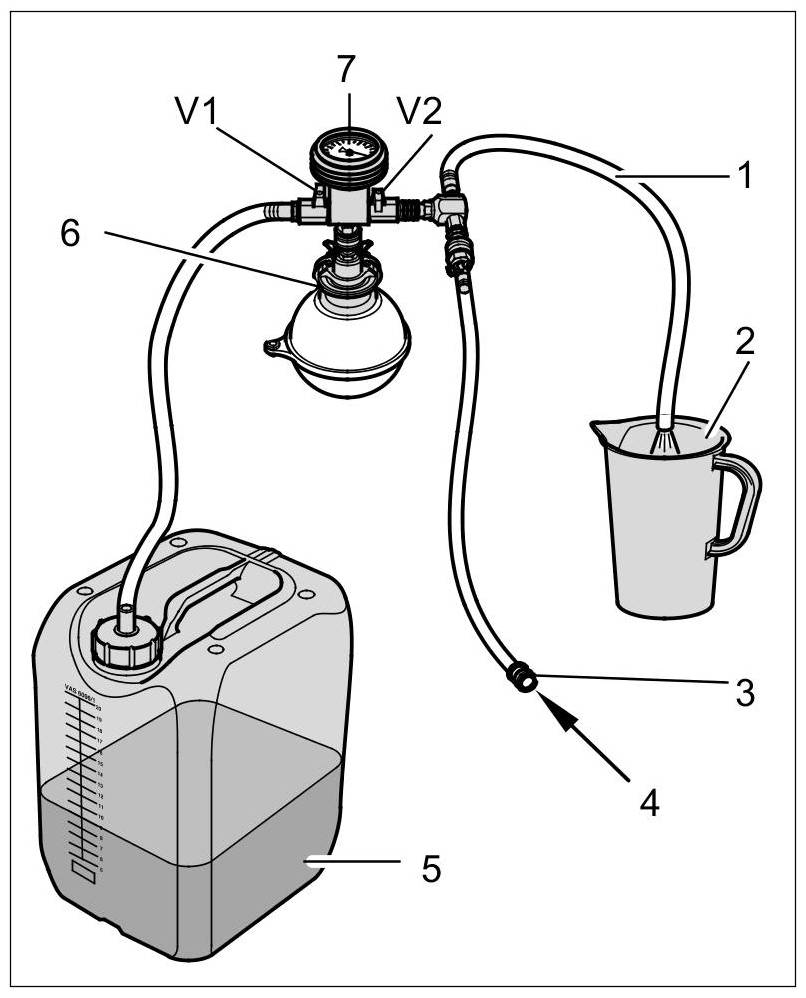 6. Push the filler hose -5- of the vacuum pressure gauge onto the canister connection. Route the return line -6- from the Venturi nozzle to a second container (bucket).