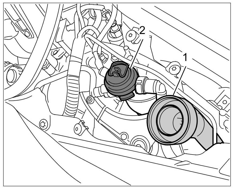 2. Move service clip on bleeder valve assembly to service position => Service position of bleeder valve assembly. The bleeder valve assembly -2- is located next to the filler neck for the coolant reservoir -1-.