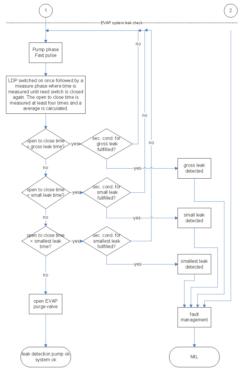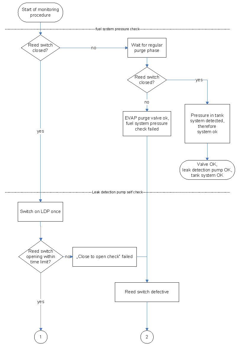 The first step of leakage diagnostics is the pressure check of fuel tank system by testing the reed switch. In case of an open reed switch, the fuel tank system has sufficient pressure for the sealed check and no further pressure has to be supplied to the fuel tank system by the LDP.