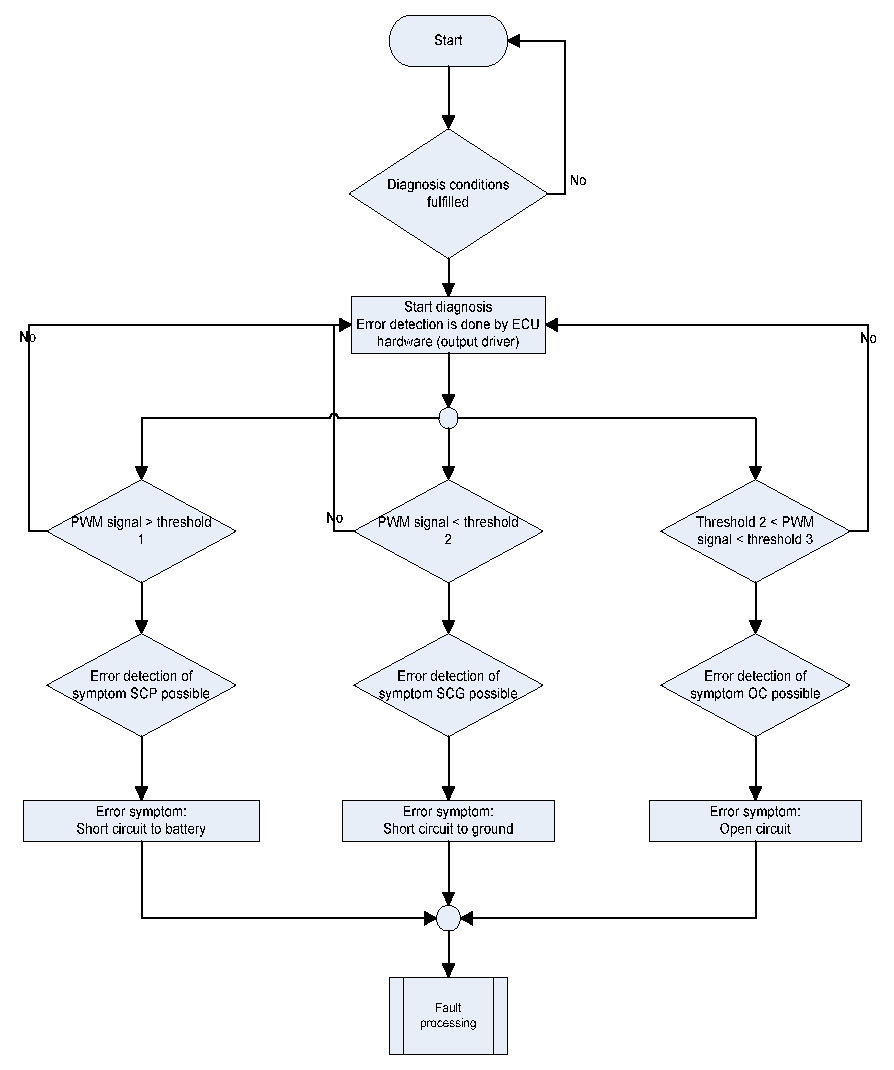 Invalid actuator output signals at power stage are regarded as circuit malfunctions shorted to BATT, GND or Open circuit.
