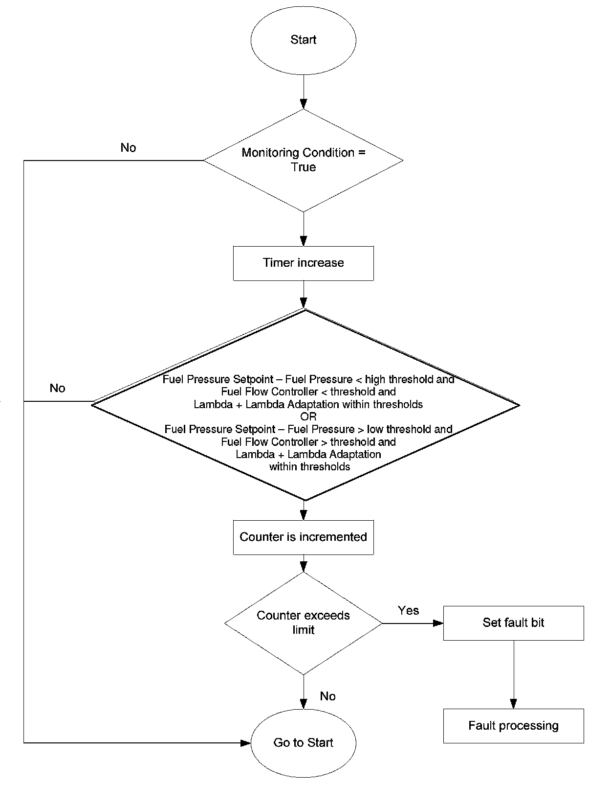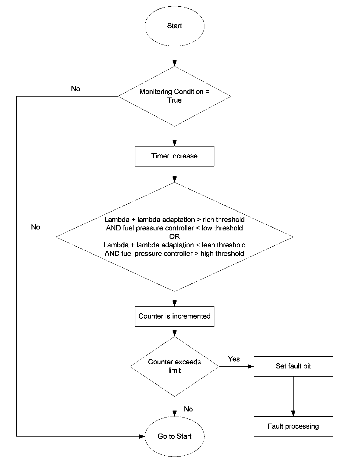 The fuel mass plausibility diagnosis checks the plausibility of the high pressure sensor signal. The diagnosis compares the output of the lambda-controller and lambda-adaptation with the output of the closed-loop controller.