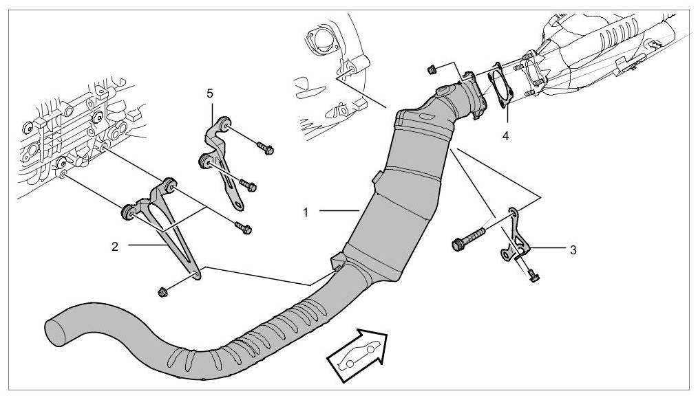- The primary catalytic converters must be installed upwards on the manifold flange with the least possible tolerance (check the distance from the rear exhaust pipe to the tunnel bridge).