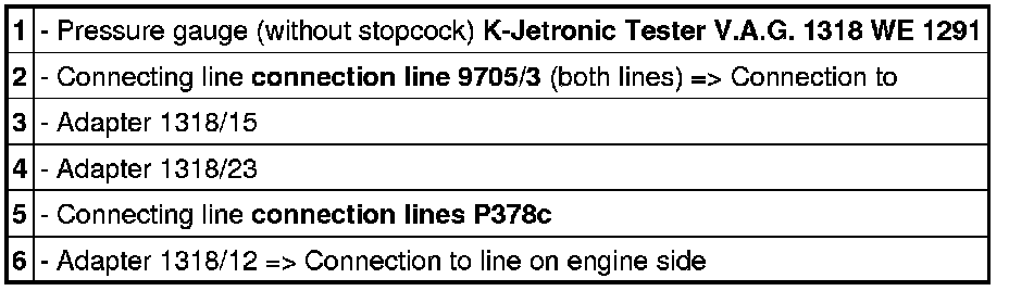 3.2. Allow engine to run for a few minutes. Switch off engine. Check the pressure drop. Drop in fuel pressure after "ignition is switched off" must not exceed 1 bar after 1 hour. Make sure that the tool setup itself does not have any leaks (even the slightest leak). The fuel retaining pressure will decrease extremely rapidly and falsify the measured result with even the tiniest leak.