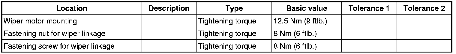 1. Screw on wiper motor. -> 921519 Removing and installing wiper motor - section on "Installing" 921519 Removing and Installing Wiper Motor=> Tightening torque: 12.5 Nm (9 ftlb.)