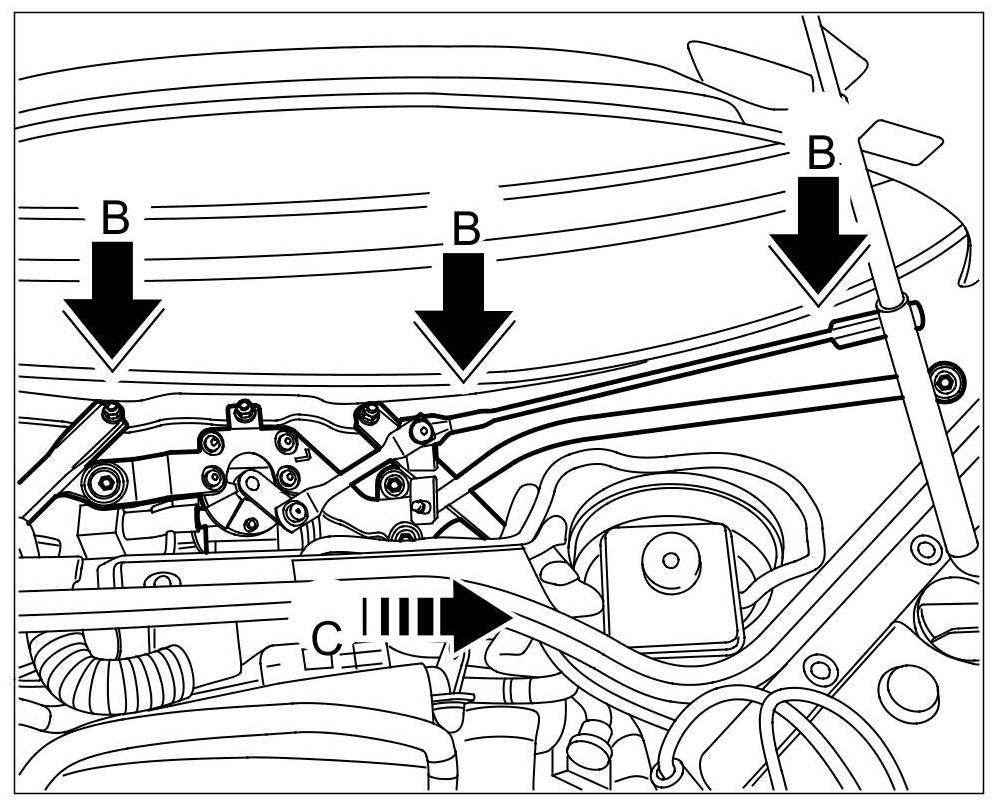 3. Move the wiper linkage so that the fastening clip on the body side is aligned with the fastening bushing -C-.