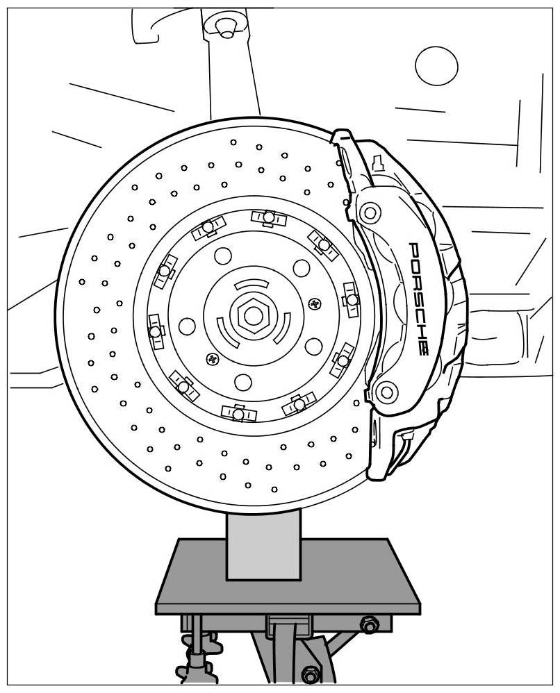 - The vehicle position is reached at the front axle with air suspension by bleeding the respective air spring using the Porsche System Tester and carefully lifting the respective wheel bearing housing.