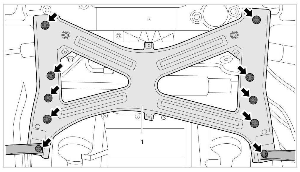 1. Install front underbody panel -> 519219 Removing and installing cover for front underbody - section on "Installing" 519219 Removing and installing Cover For Front Underbody.
