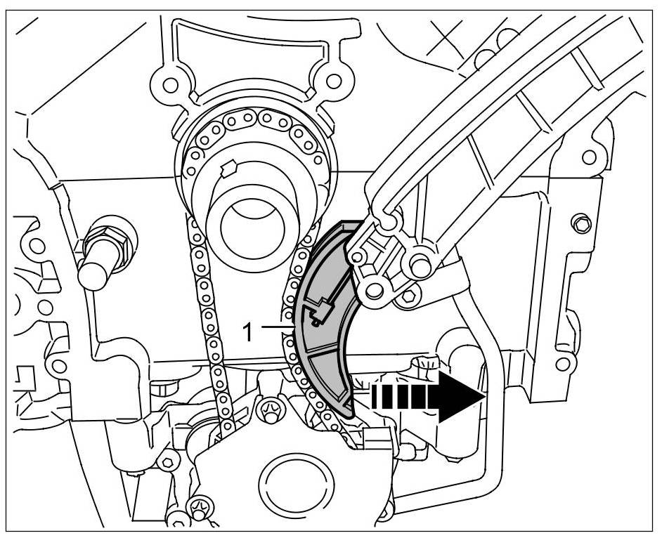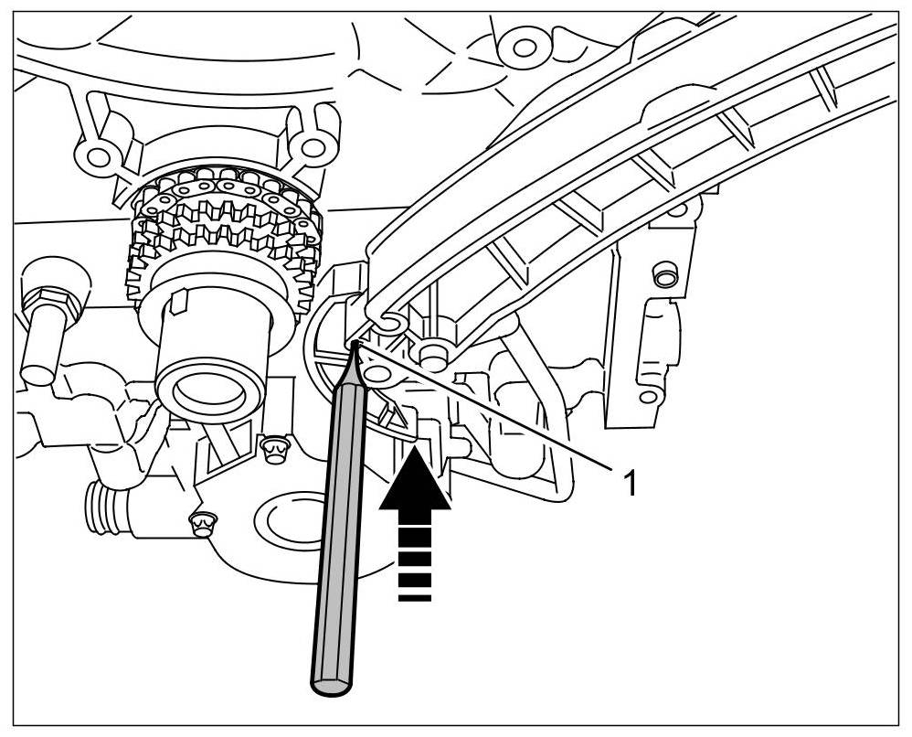 4. Stake tensioning rail for oil pump chain through the hole in the guide rail using a suitable drill bit, drift punch or nail. This slackens the oil pump chain. => Staking tensioning rail for oil pump chain