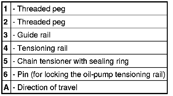 2. Fit the guide rail -3-. The small tensioning rail is locked on the guide rail with -6-. Slide the guide rail onto the threaded peg and move it into the correct installation position with respect to the fitted oil pump drive chain. Pull the locking pin (the tensioning rail becomes attached).