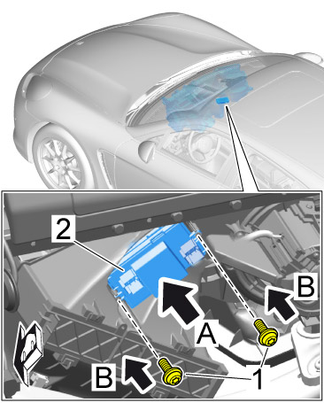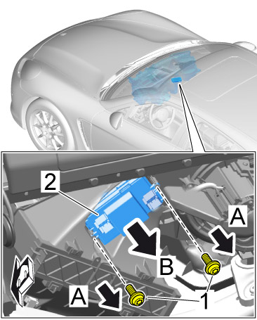 3. Unscrew fastening screws -1- and remove blower regulator -2- ( -arrow B- ).