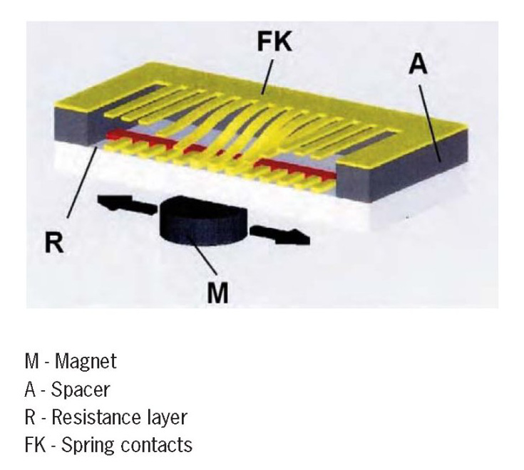 The electrical output signal is varied proportionally depending on the magnet position. Thanks to the magnetic coupling principle, it was possible to hermetically seal the measuring system. As a result, there is no risk of soiling of the micro-contacts even under extreme ambient conditions.
