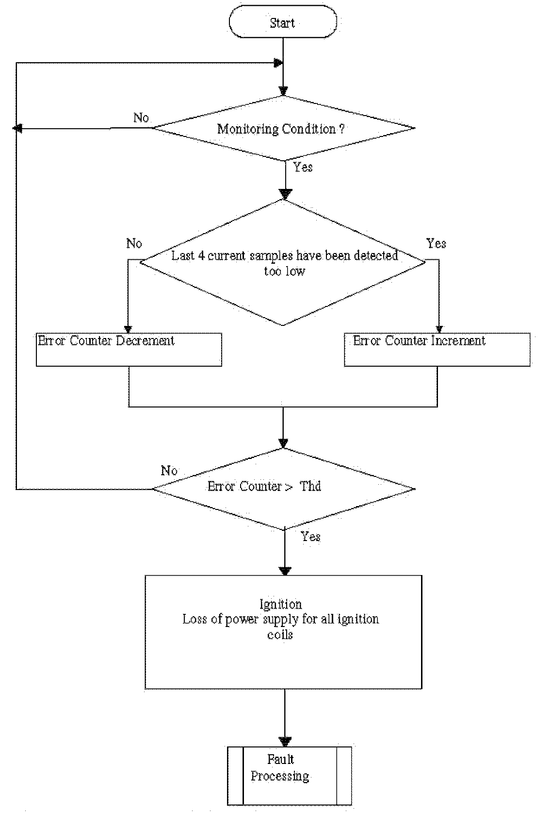 The diagnosis is made by an analogue acquisition of current feedback of the coil. If this current feedback for the last 4 ignition coils is below a calibratable threshold, loss of power supply for all ignition coils is detected.