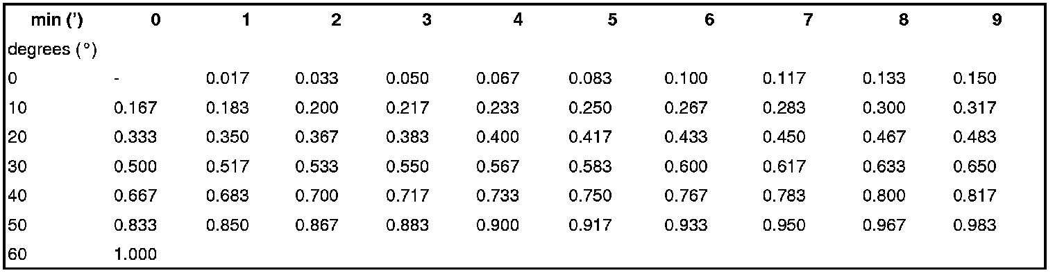 - Example 1: toe 17 min (17') = 0.283 decimal degrees according to table. Procedure for this: The imaginary line starting at the top of the 7-min column moving downwards and the line starting on the left in the 10-min row moving right meet at point/column 0.283.