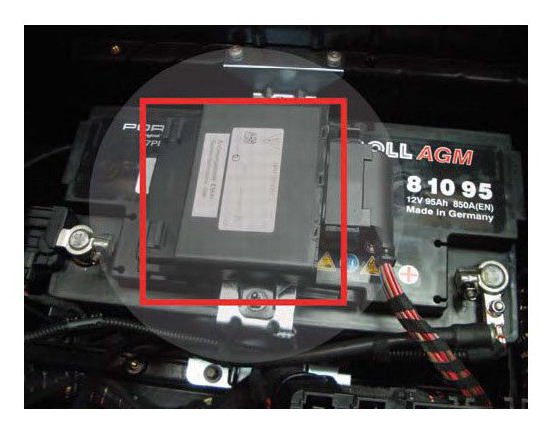 The DC/DC converter is only installed in vehicles with Start Stop systems. The DC/DC converter is installed in the luggage compartment, underneath the luggage compartment cover and above the battery.