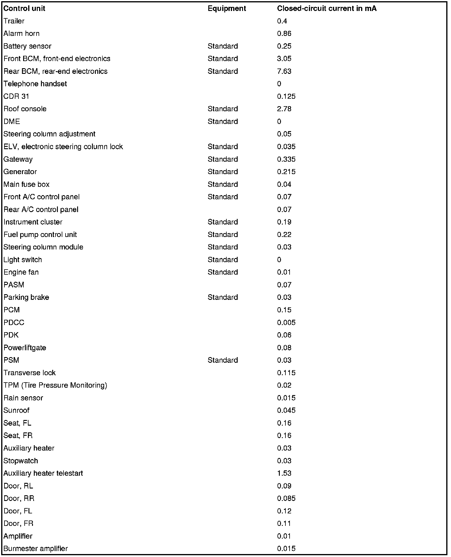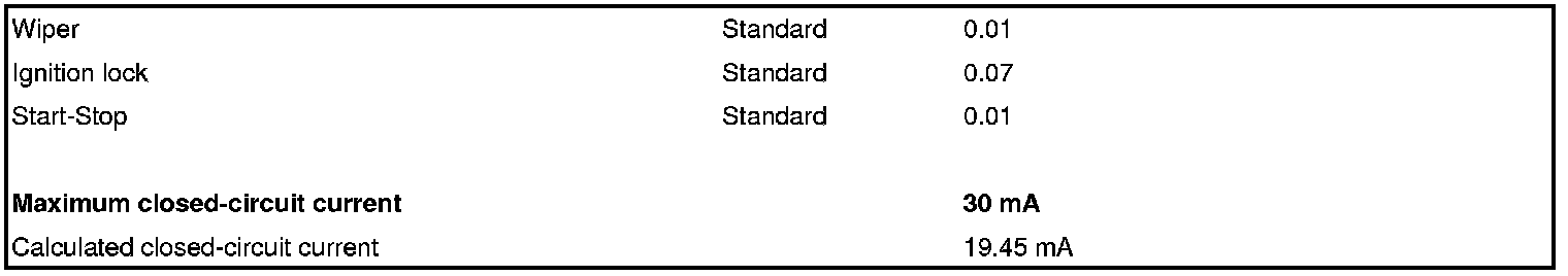 - Before measuring the closed-circuit current, determine the vehicle equipment (I-numbers) and establish the expected closed-circuit current with the aid of the attached table.