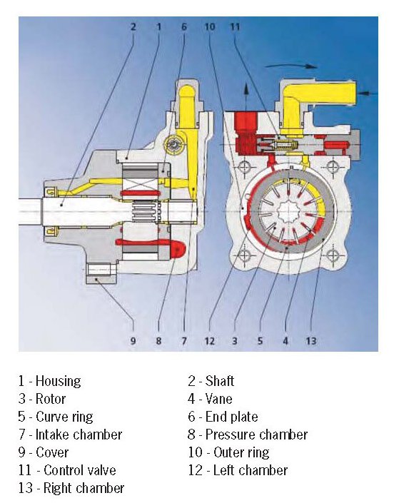 Unlike normal ZF vane-type pumps, the curve ring (5) in the rotor set in the VARIOSERV pump can be adjusted and can generate a variable geometric flow rate thanks to the varying eccentricity. The curve ring is adjusted according to engine speed based on the pre-existing differential pressure between the left (12) and right chambers (13). A control valve (11) with integrated pressure control fitted at a right angle to the shaft (2) essentially controls how it works.