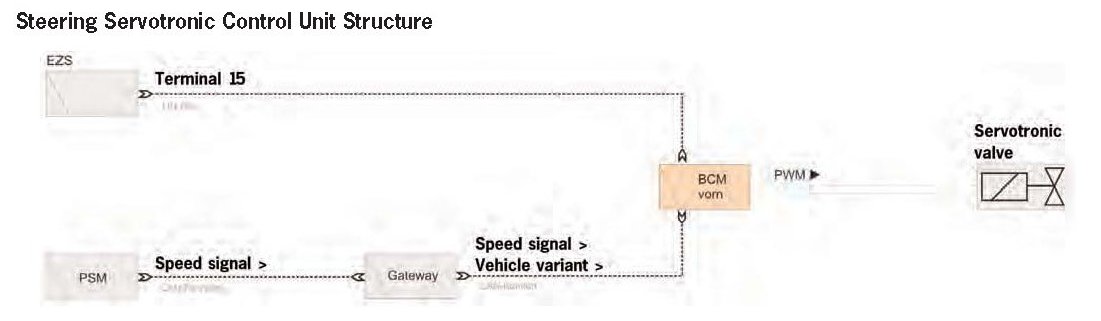 The on-board computer control unit (BCM) receives information about speed and vehicle variant via the gateway. The Servotronic valve is controlled via a corresponding PWM signal. The steering remains fully functional in the event of an electrical malfunction. If the power supply fails, the converter valve opens to maximum, i.e. maximum hydraulic feedback or "high-speed characteristic".