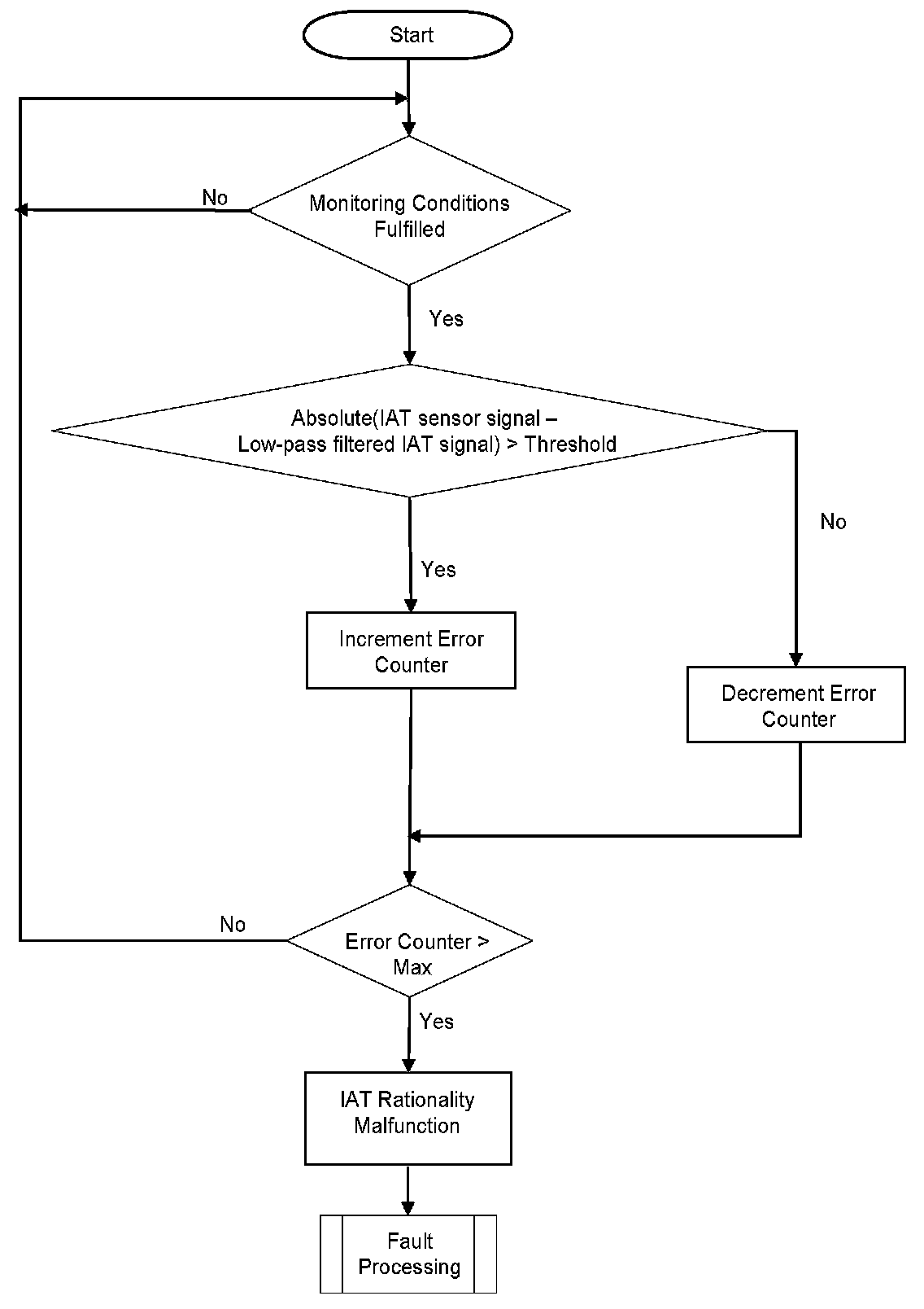 The purpose of this diagnosis is to detect an implausible gradient on the intake-air-temperature sensor signal. The diagnosis checks whether the difference between the measured IAT value and a low-pass-filtered (PT1) IAT signal exceeds a calibrate able threshold. If this is the case, a intermittent IAT signal is detected.