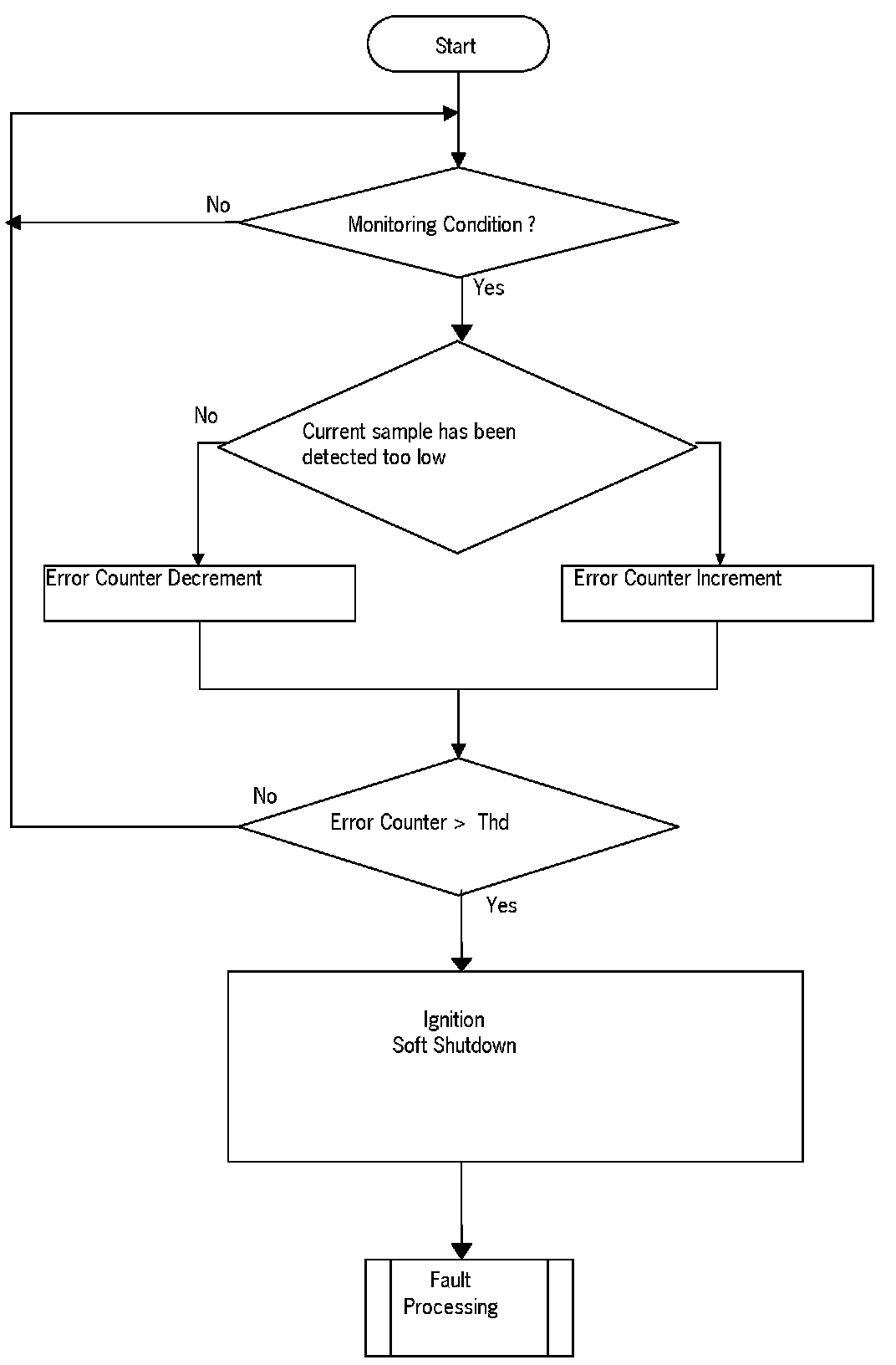 The diagnosis is made by an analogue acquisition of current feedback of the coil. If this current feedback is below than a calibratable threshold, soft shutdown is detected.