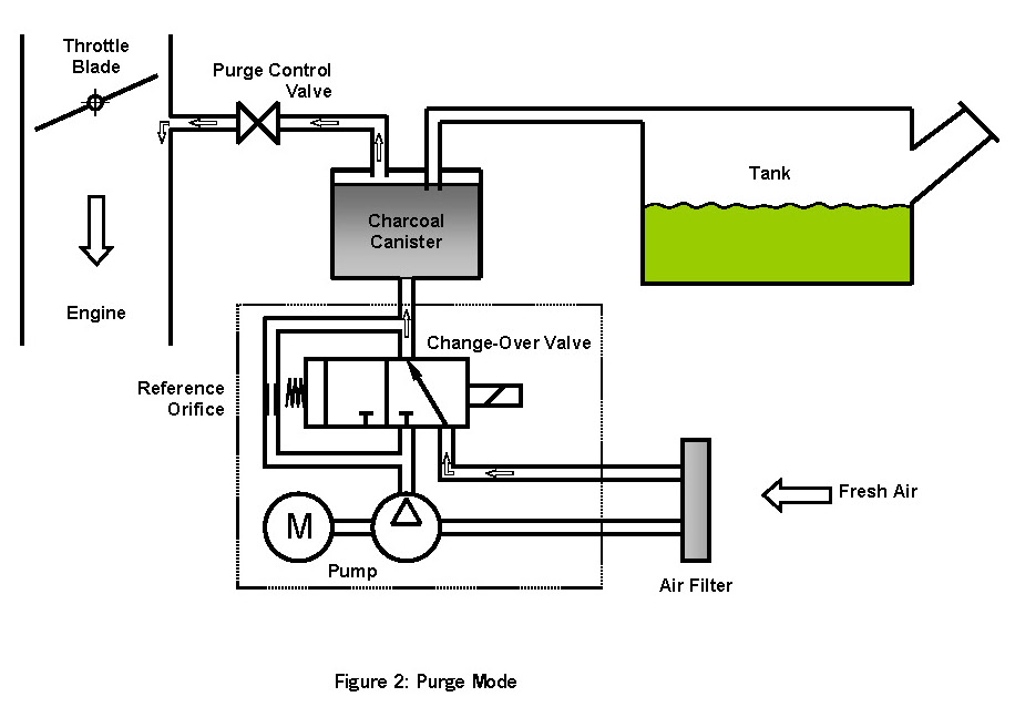 In the Monitoring Mode (Fig. 4) the change-over valve is switched on while the purge control valve remains closed. The motor current drops to a zero-load level. Fresh air is now pumped through the charcoal canister into the tank. A small overpressure, indicated by an increase in the motor current, builds up if the evaporative system is tight.