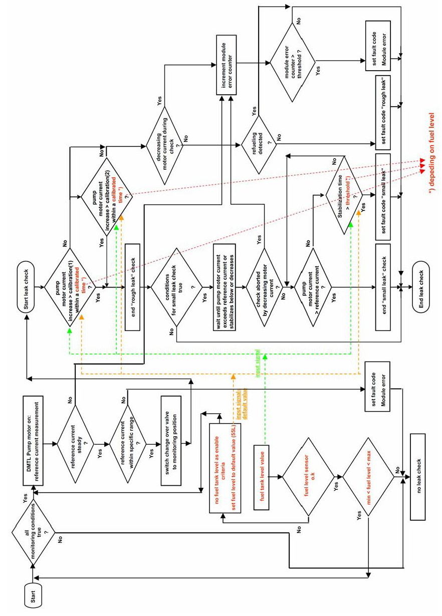 The small leak check is performed if and only if the rough leak check has been performed and no rough leak was detected. If the enable conditions for the small leak check (more than 0.02 in) are fulfilled, the pump's motor remains in the active state (monitoring mode) until its current exceeds the reference current, or the motor current gradient is close to zero (current stabilizes below the reference current). If the motor current exceeds the reference current, the evaporative system is considered as tight. A small leak is assumed only if a second small leak check confirms a current stabilization below the reference current.