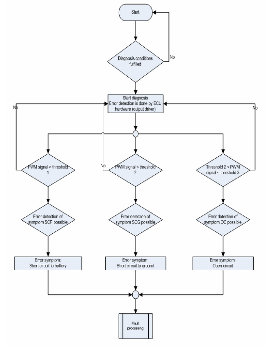 If the PWM from the fuel rail pressure regulator lies below the lower calibration limit, a short circuit to ground is detected and a minimum fault is set.