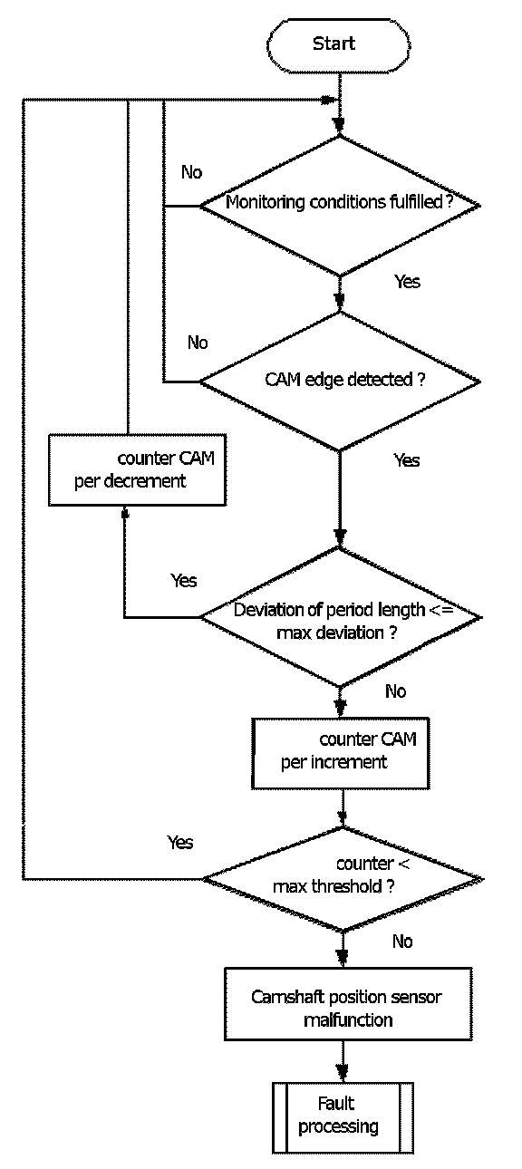 The monitor checks once per combustion cycle the edge counter of the camshaft. If the edge counter has not changed during the last cycle, a cycle counter is incremented. When the counter reaches a threshold, the error CAM_plaus is delivered to the error management.