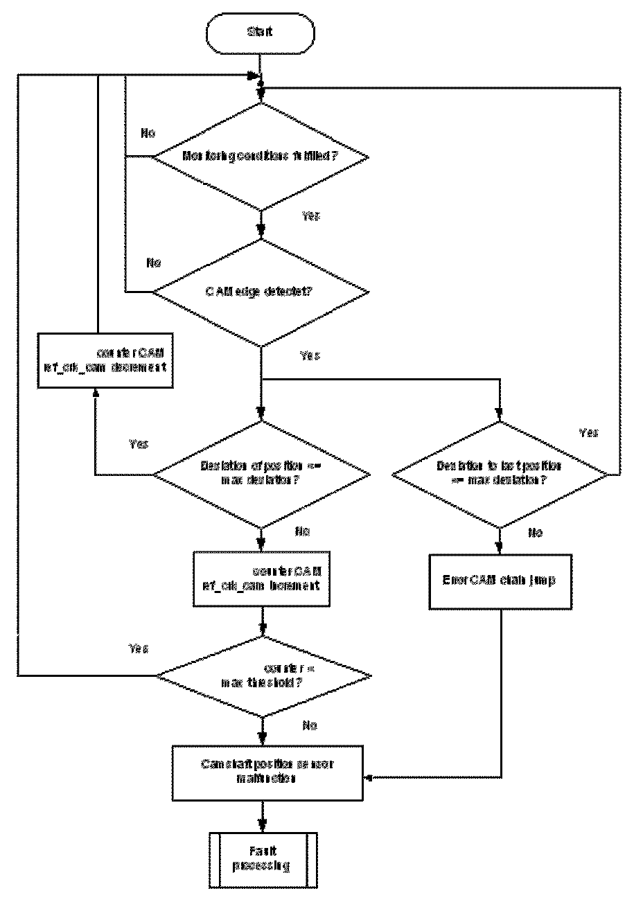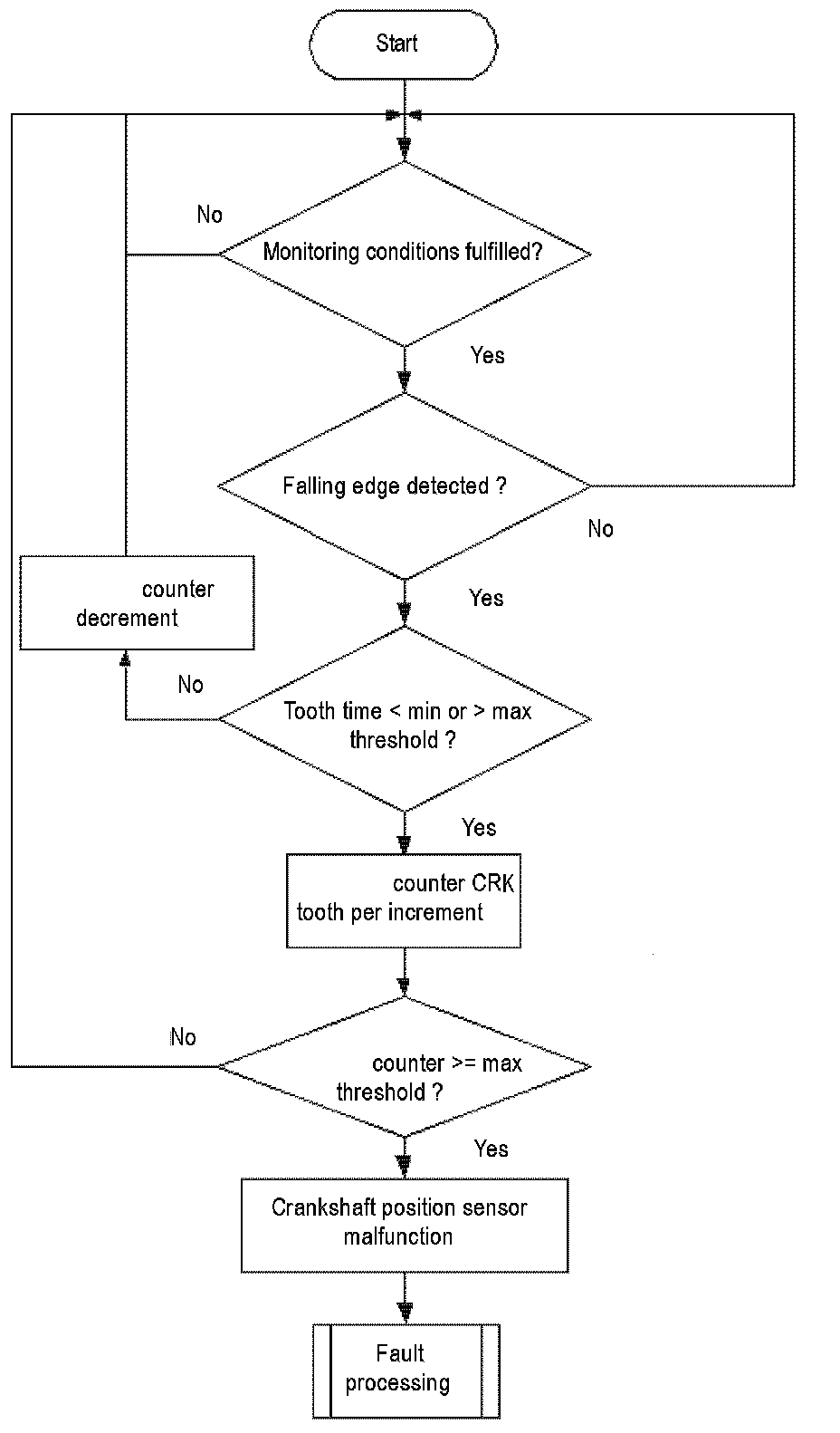 A teeth counter is incremented at every falling edge of the CRK sensor signal. If plus or minus one tooth is detected Flowchart diagnosis of mechanical reference position and diagnosis of chain jump. 360 ° CA at the reference gap, the tooth number counter will be incremented. If the counter exceeds a limit, a CRK tooth error is delivered to the error management.