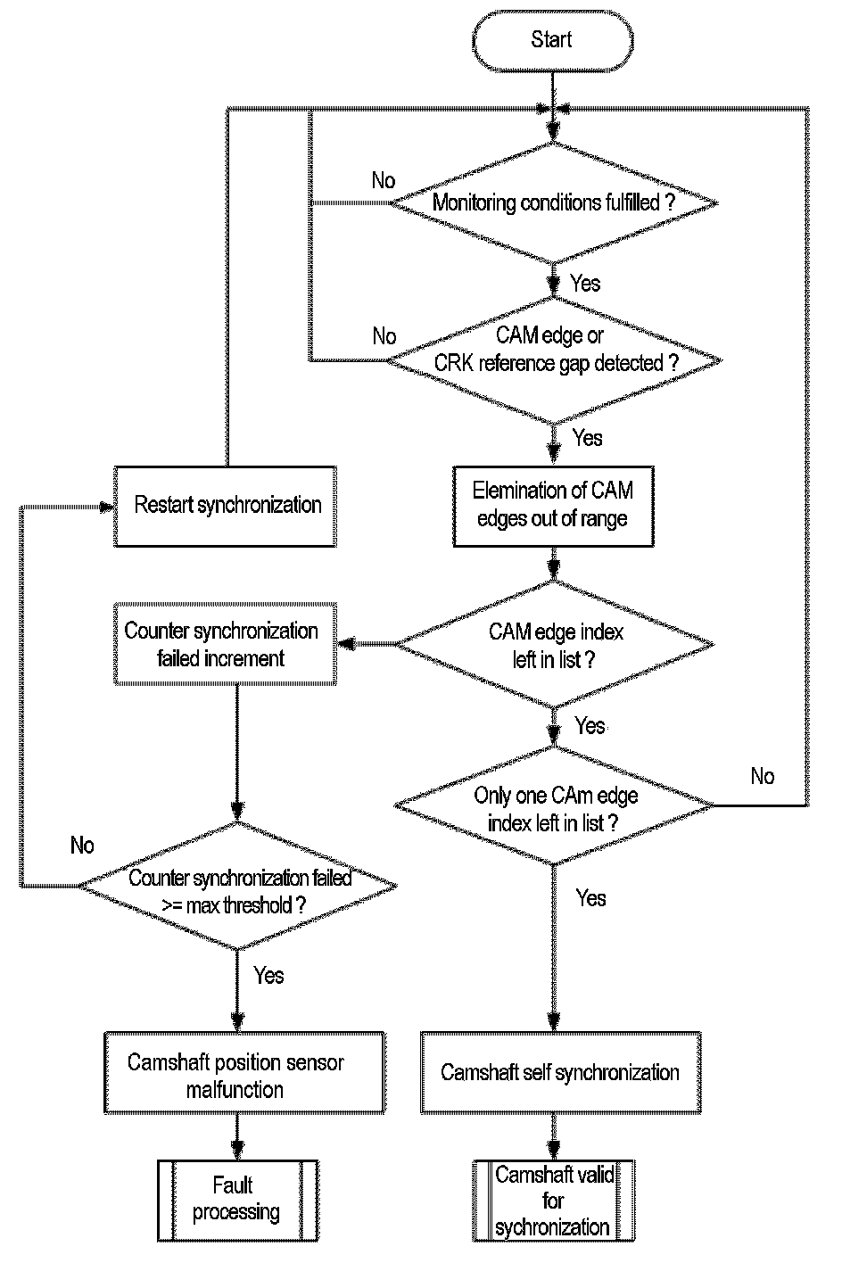 The monitor checks at every reference gap of the crankshaft sensor signal whether the camshaft is synchronized or not. If the camshaft is not synchronized, a revolution counter for the camshaft is incremented. When the counter reaches a threshold the error CAM sync is delivered to the error management.