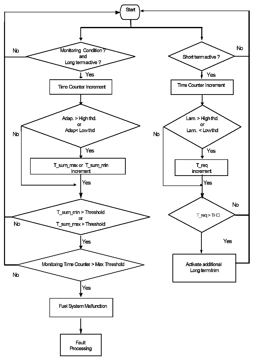 The fuel system diagnosis is monitoring the long term fuel trim deviation based on the lambda adaptation function. This evaluation of the long term fuel trim is active during its learning process and is not active during canister purge phases of the evaporative system. Because of this an additional learning process (forced adaptation) can be started in case of large deviations of the short term fuel trim (lambda controller) and the evaluation can run. When monitoring conditions are met different timers are started to react on failure and no failure case.
