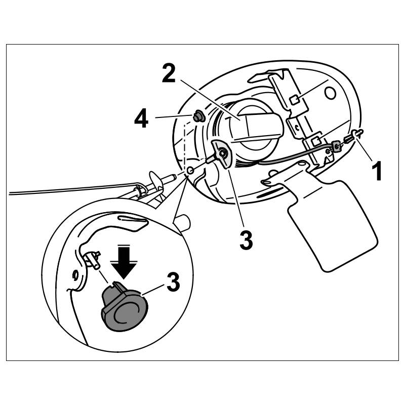 1. Press in plastic expansion rivet -1- on fuel tank cap -2-. Then clip in rubber stop -3- and rubber sleeve -4-.