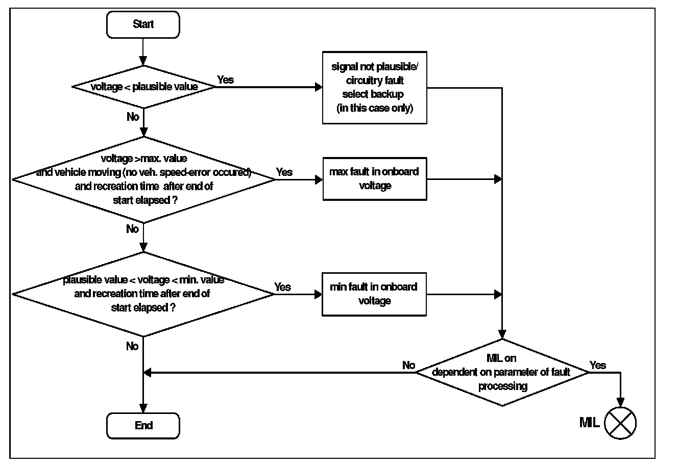 The check of the min. value (fault in the vehicle's electrical power supply system) is only allowed after a delay time from the end-of-start, when the voltage has recovered from the starter activation.