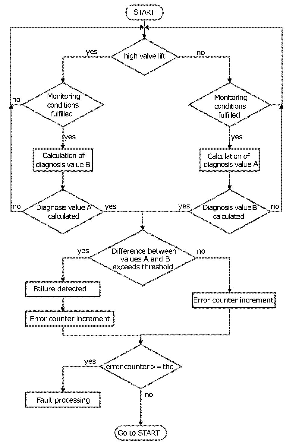 If the difference between the diagnosis values A and B exceeds a certain threshold a failure is detected.