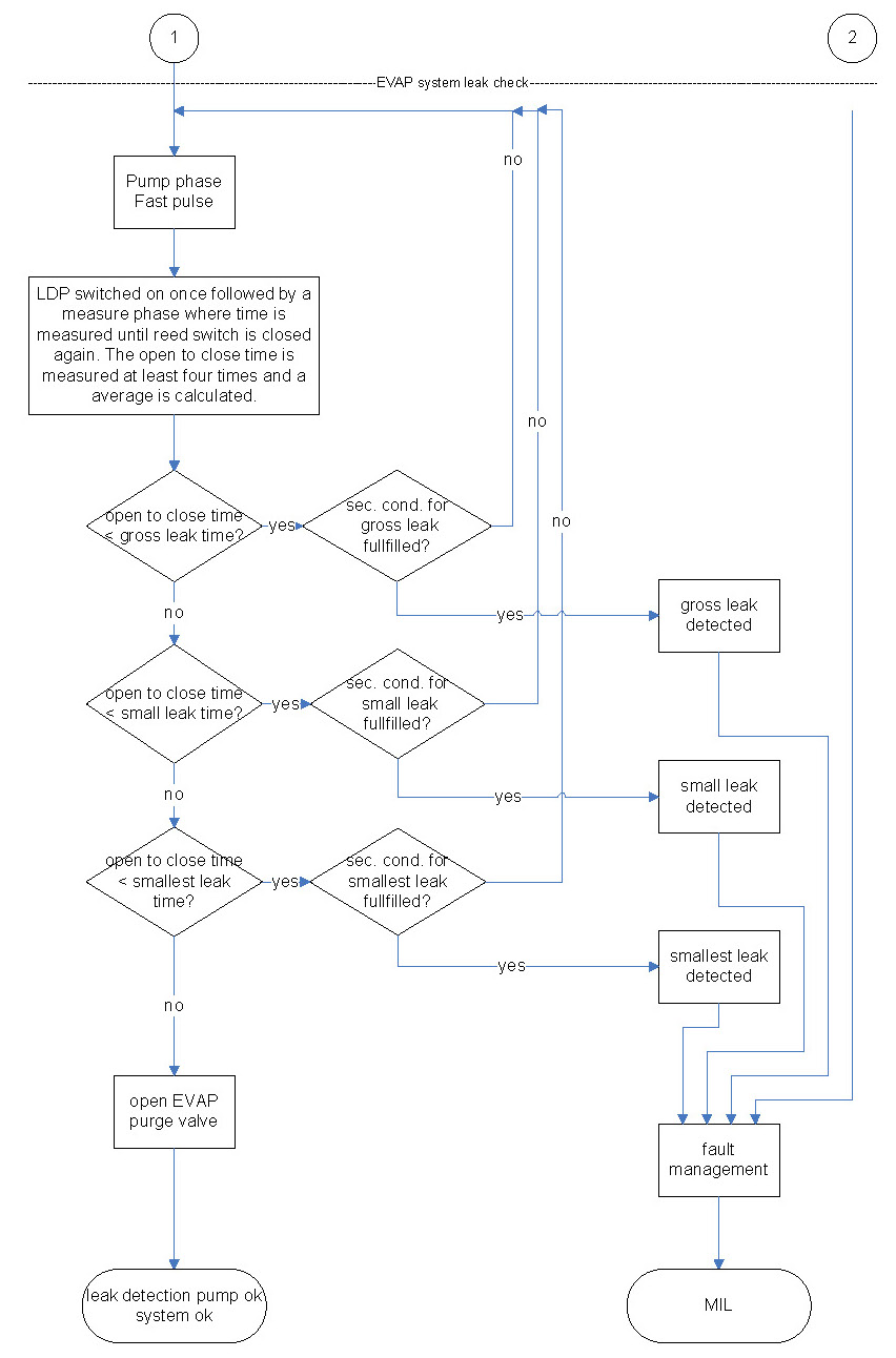 The first step of leakage diagnostics is the pressure check of fuel tank system by testing the reed switch. In case of an open reed switch, the fuel tank system has sufficient pressure for the sealed check and no further pressure has to be supplied to the fuel tank system by the LDP.