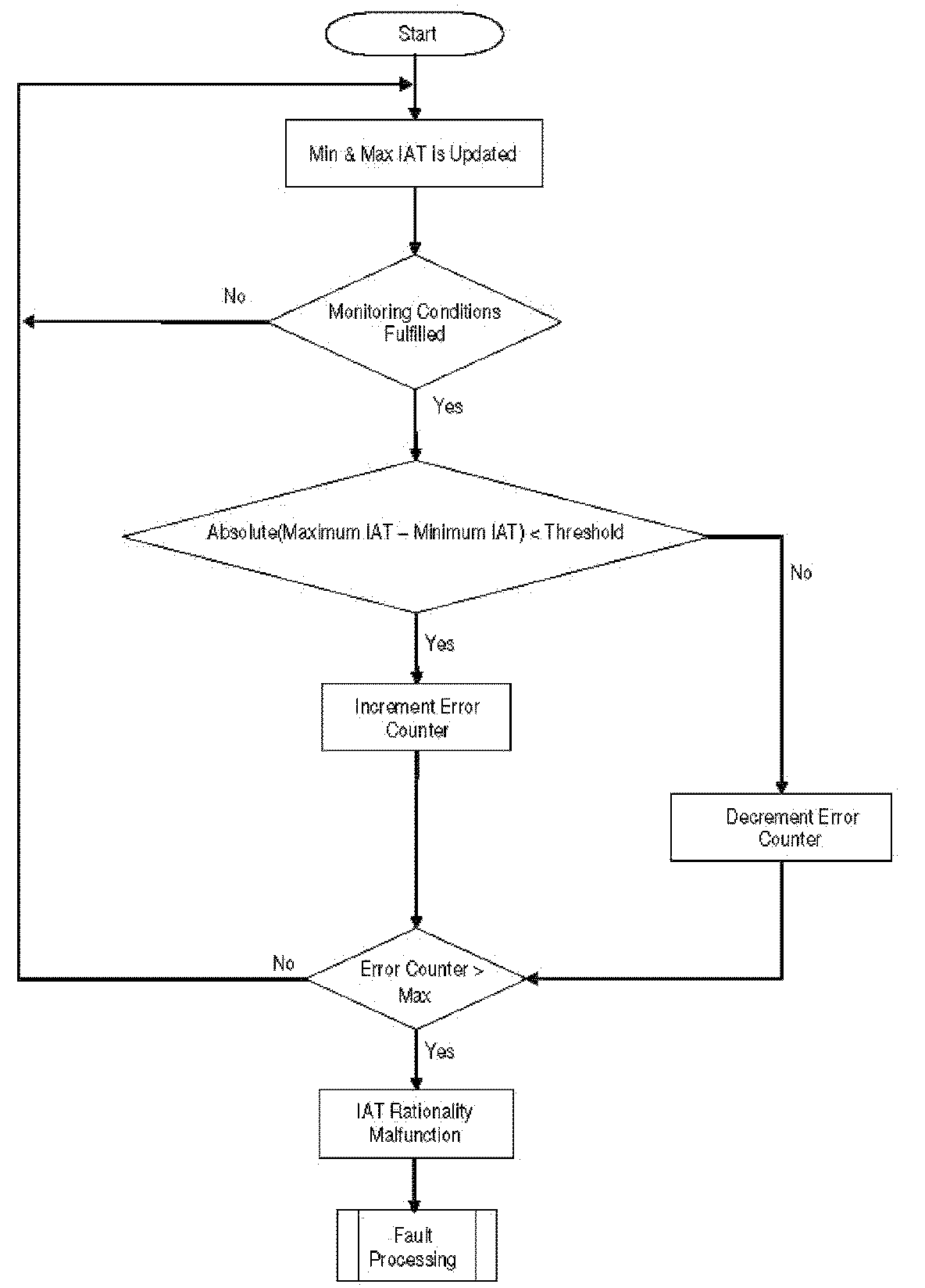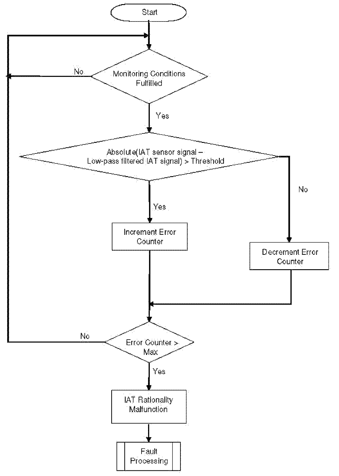 This diagnosis checks IAT for a Stuck signal. If the vehicle was driven for a minimum required distance and time-after-start, then the change in the IAT signal during this period should be above a calibrate able threshold. If this is not the case, a stuck IAT signal is detected.