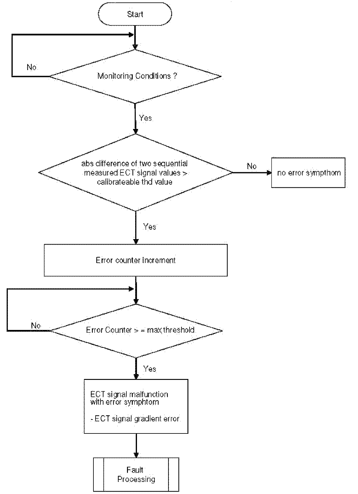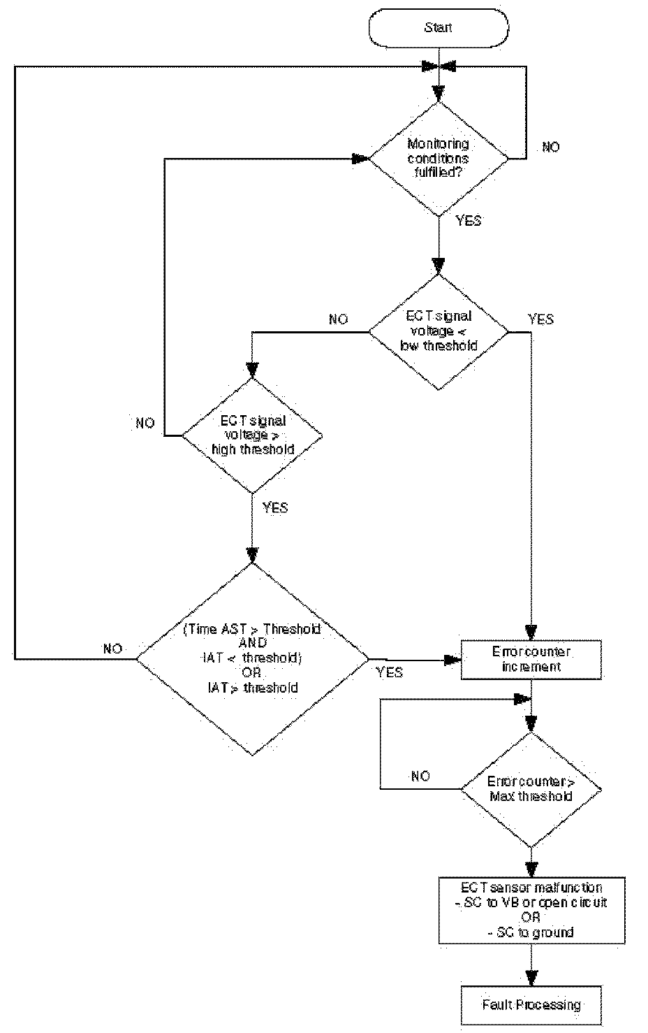 The purpose of this diagnosis is to detect electrical faults of the sensor signal. The input signal is analog from a NTC and has to be in a calibratable range. Short cut to ground can be detected immediately, short cut to voltage battery or open load after a delay time. If an error symptom is detected, the error counter is debounced.