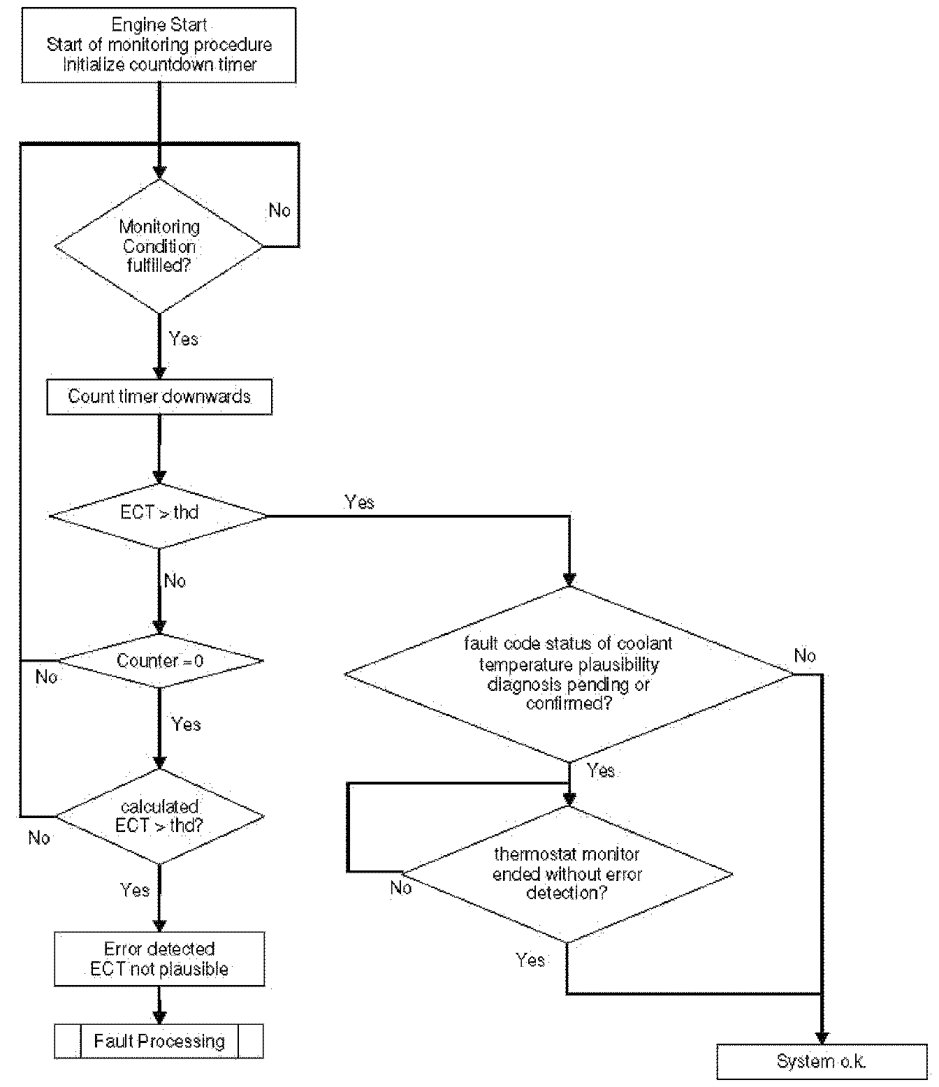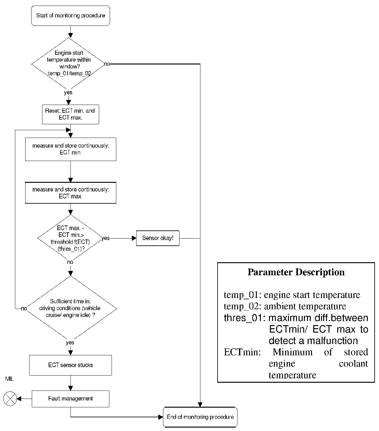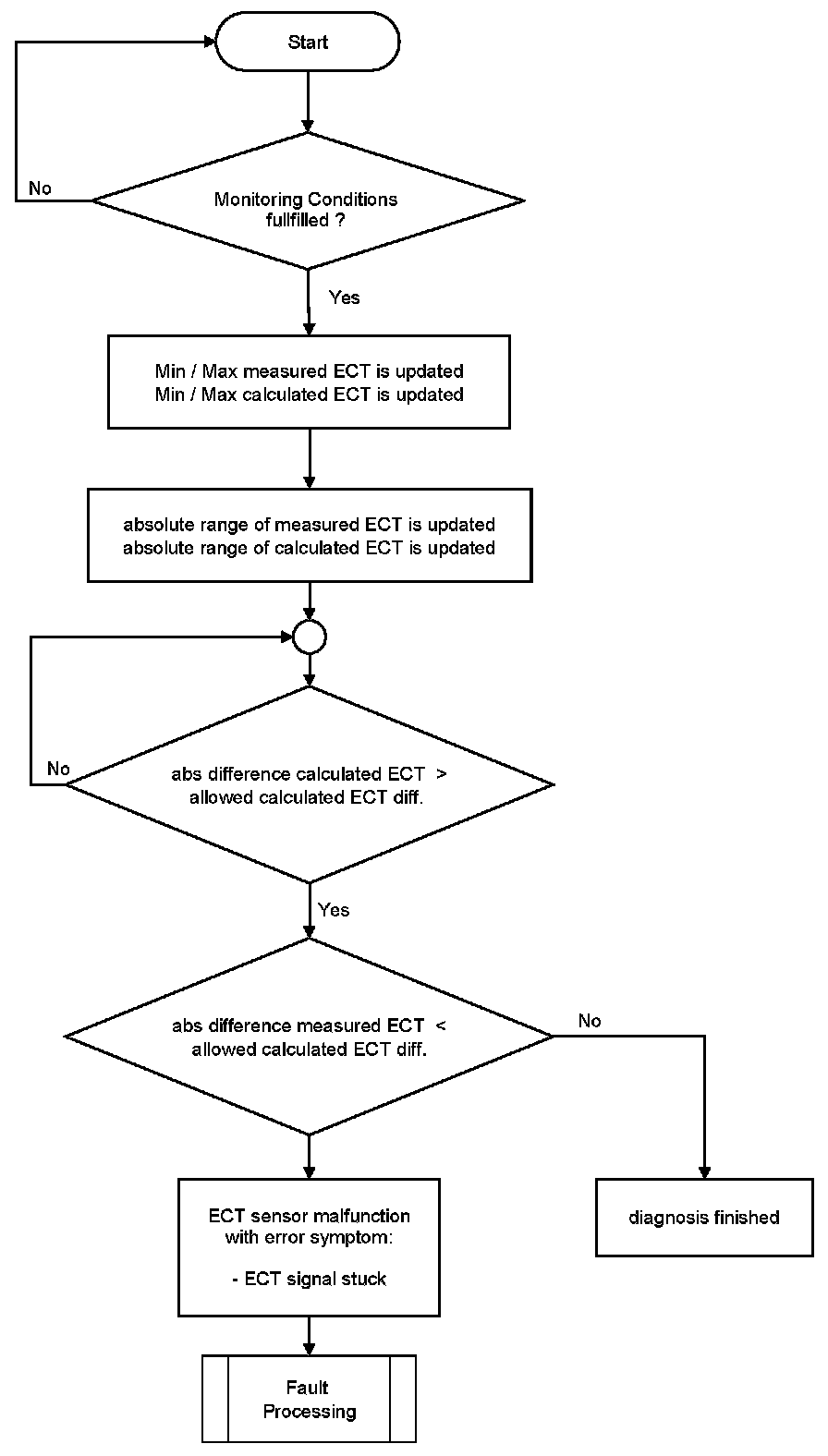 After engine start the system stores continuously the lowest and highest ECT. In case that after several driving conditions the difference between ECT max and ECT min is lower than the threshold stuck signal error is detected.