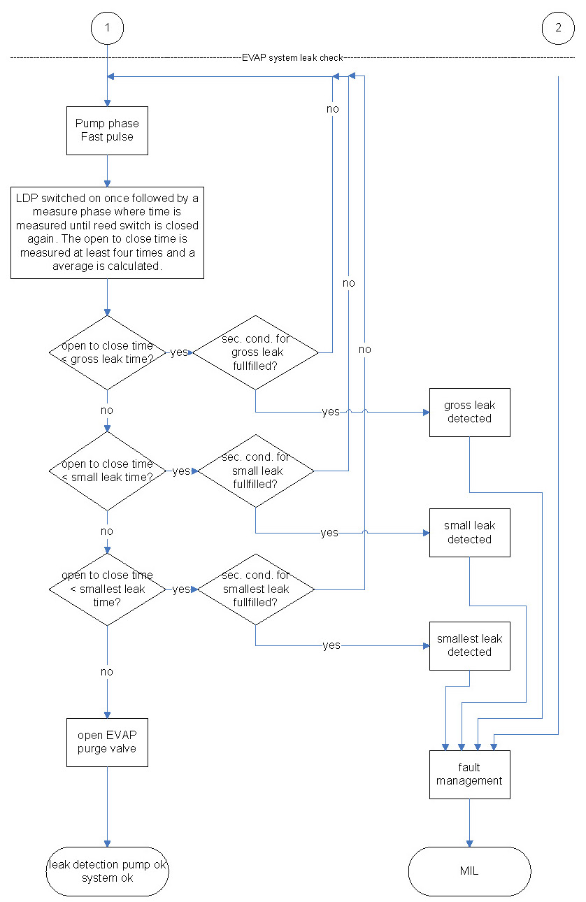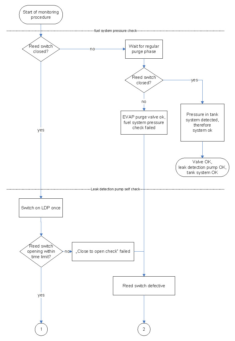 The first step of leakage diagnostics is the pressure check of fuel tank system by testing the reed switch. In case of an open reed switch, the fuel tank system has sufficient pressure for the sealed check and no further pressure has to be supplied to the fuel tank system by the LDP.